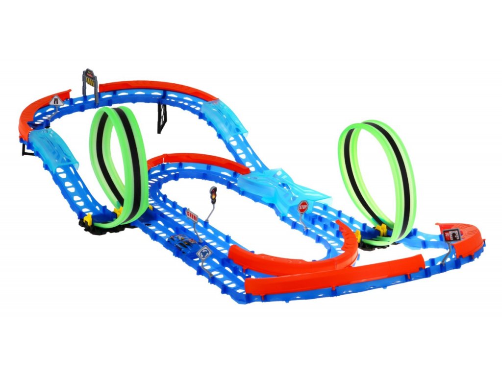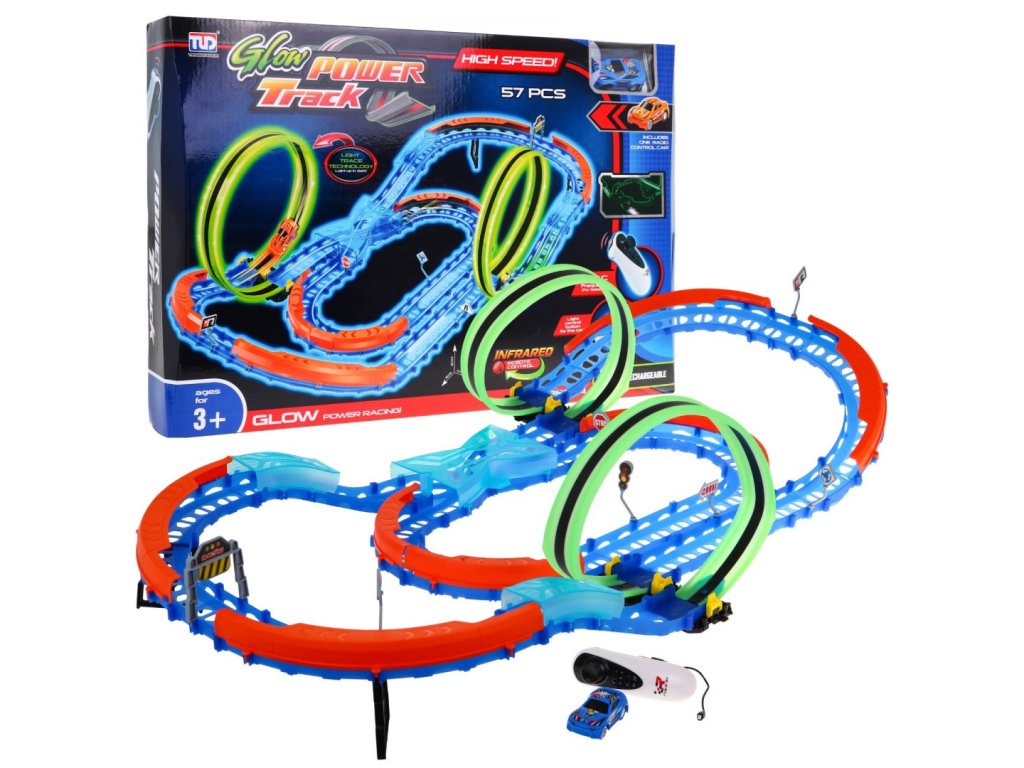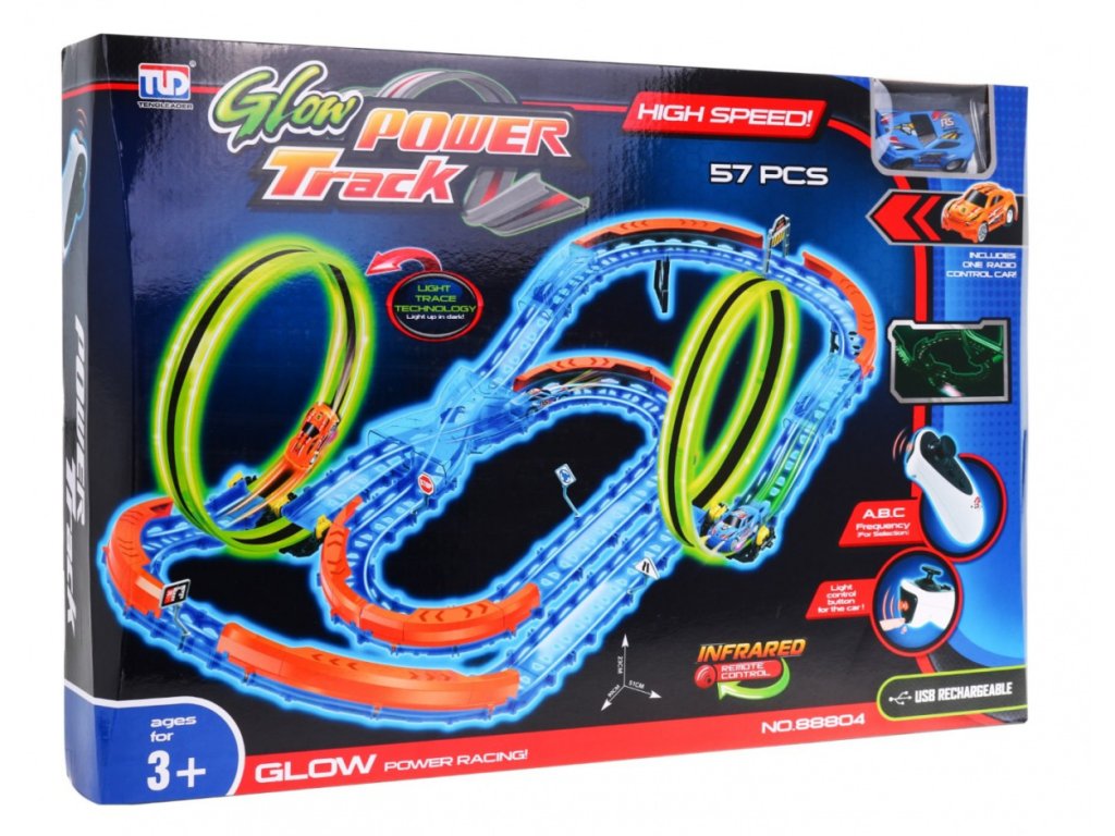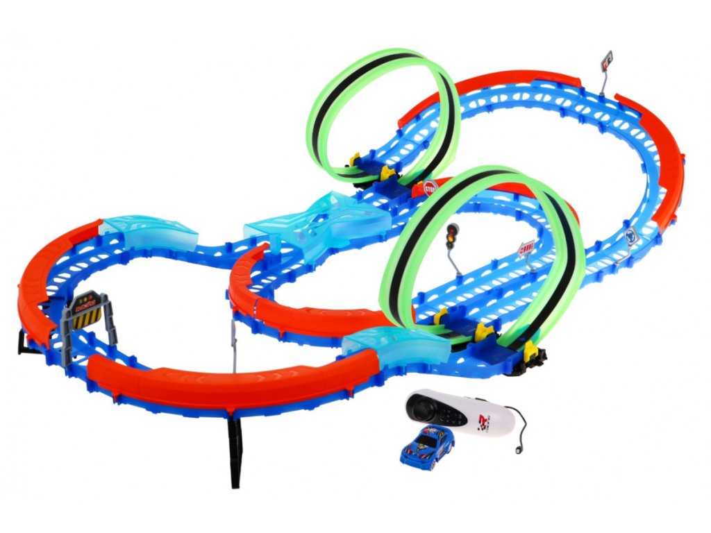 Velká dráha se dvěma smyčkami je určena pro děti od 3 let. Hračka je napájena bateriemi typu 1 x 3,7 V (auto, v balení) a 2 x AAA (dálkový ovladač, není součástí balení). Dráha je fluorescenční a svítí ve tmě. Autíčko má LED osvětlení, které při jízdě vytváří úžasné světelné efekty. Přejeme skvělou zábavu!