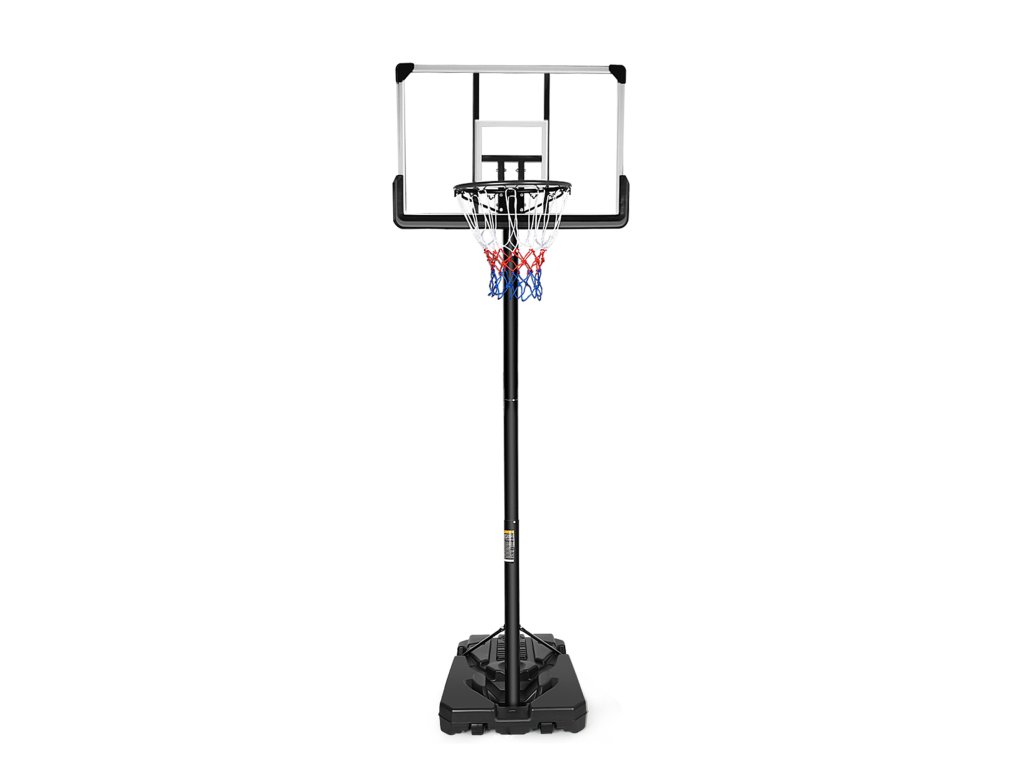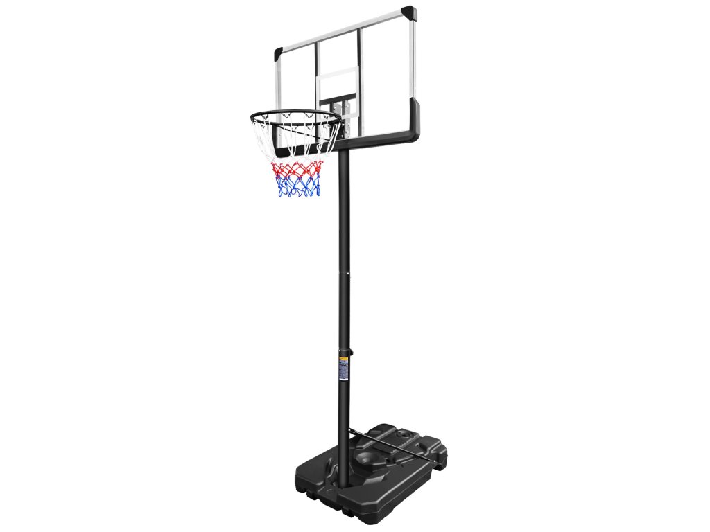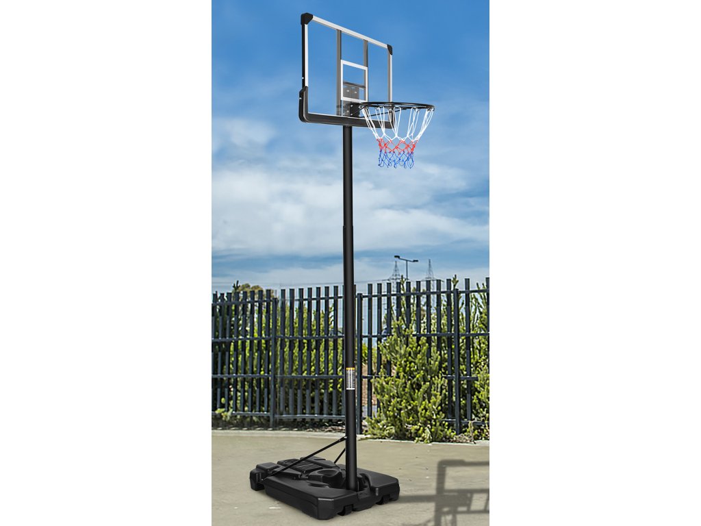 Mobilní basketbalový koš s nastavitelnou výškou, pevnou plastovou deskou a obroučkou se sítí.