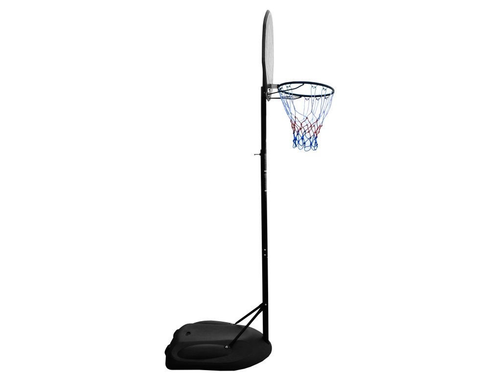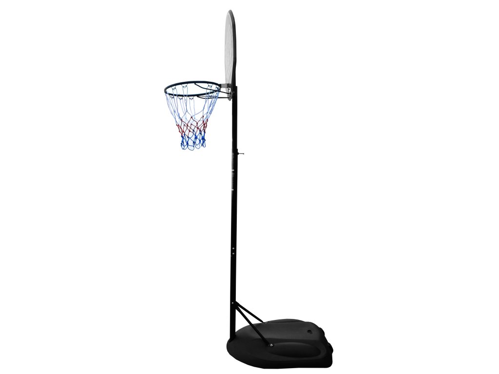 Mobilní basketbalový koš s nastavitelnou výškou, pevnou plastovou deskou a obroučkou se sítí.
