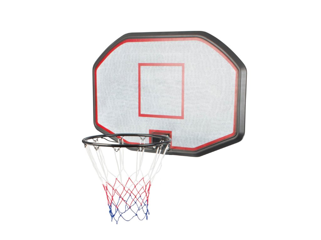 Na odrazové desce s klasickými červenými čarami je upevněn basketbalový koš s ocelovou obroučkou o průměru 43 cm lakovanou práškovým lakem a se síťkou odolnou proti povětrnostním vlivům.