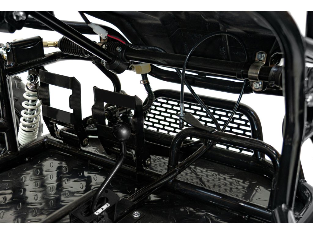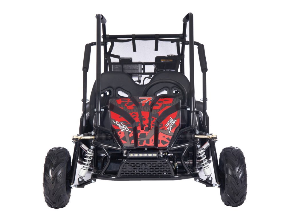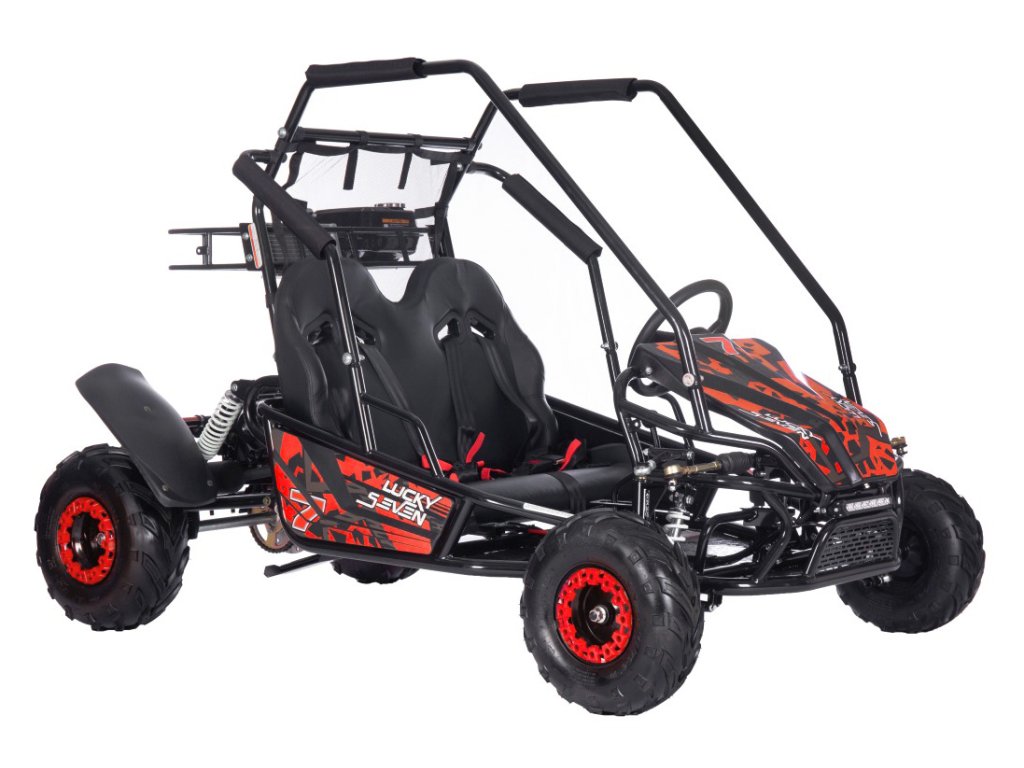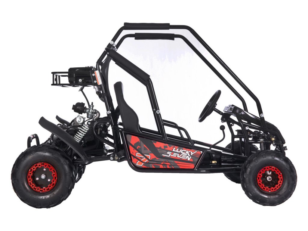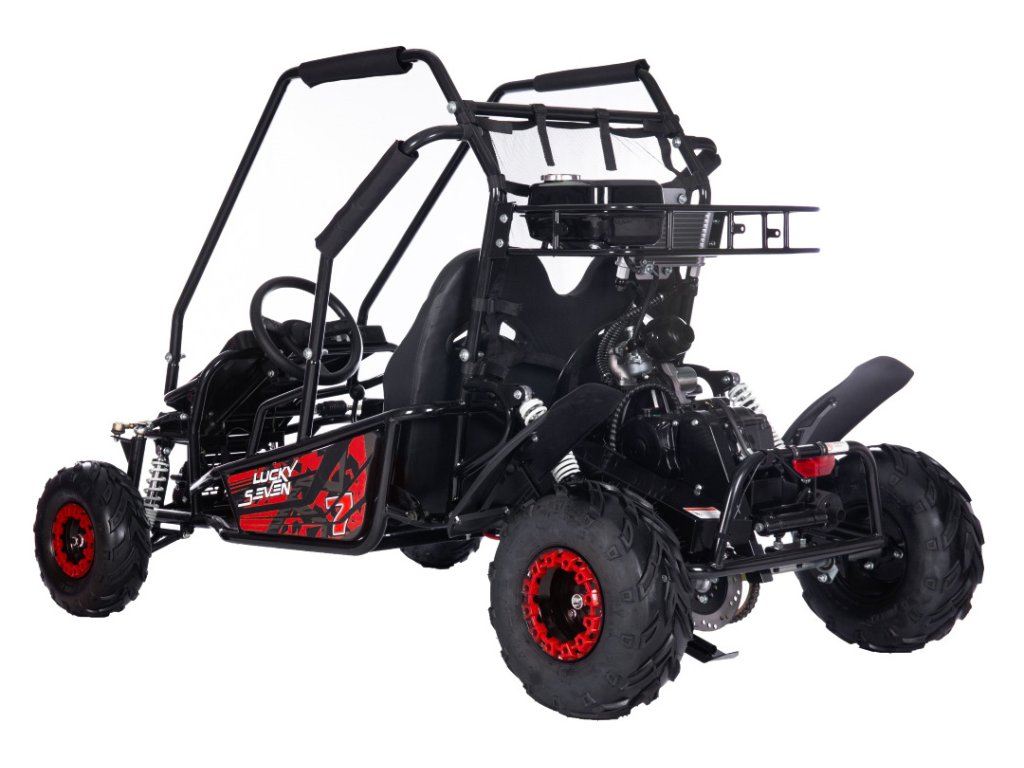 BUGGY LUCKY SEVEN LIFT je robustní spalovací terénní vozidlo navržené pro zábavu i dobrodružné jízdy mimo zpevněné cesty. Je vybavena čtyřtaktním jednoválcovým motorem o objemu 125 cm³ s chlazením olejem, který dosahuje rychlosti až 46 km/h. Díky automatické převodovce a zpátečce je ovládání velmi jednoduché i pro méně zkušené jezdce. Rám buggy je práškově lakovaný a zesílený pro maximální bezpečnost, včetně ochranné klece pro řidiče i spolujezdce. Kromě toho nabízí sportovní vodotěsné sedačky s bezpečnostními pásy a nastavením v 3 polohách. Buggy má hydraulické kotoučové brzdy, nafukovací terénní pneumatiky a plně funkční světelnou výbavu. Zadní nosič s rozměry 58×30×8 cm umožňuje převážet menší náklad.