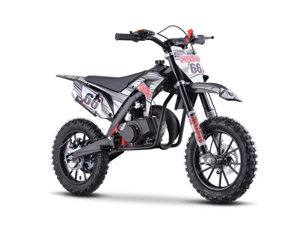Benzínová motorka 49cc TIGER je ideální volbou pro mladé jezdce i začátečníky. Díky robustnímu, práškově lakovanému rámu a kvalitním pružným plastům je mimořádně odolná a připravena zvládnout i náročnější terén. Srdcem motorky je vzduchem chlazený jednoválcový dvoutaktní motor o objemu 49 cm³, který poskytuje dostatek výkonu pro dynamickou jízdu. Motorka dosahuje rychlosti až 40 km/h, což je ideální pro bezpečné seznámení se s jízdou. Komfort jízdy zajišťuje měkké, voděodolné sedadlo z ekokůže a odpružení – přední teleskopické a zadní s nastavitelným tlumičem. Nafukovací pneumatiky s hlubokým vzorkem zaručují skvělou trakci na různých površích. Bezpečnost je zajištěna kotoučovými brzdami na přední i zadní nápravě a bezpečnostní pojistkou, která automaticky vypne motor při vytržení. Motorka je vybavena řetězovým pohonem a snadno ovladatelným ručním startem.