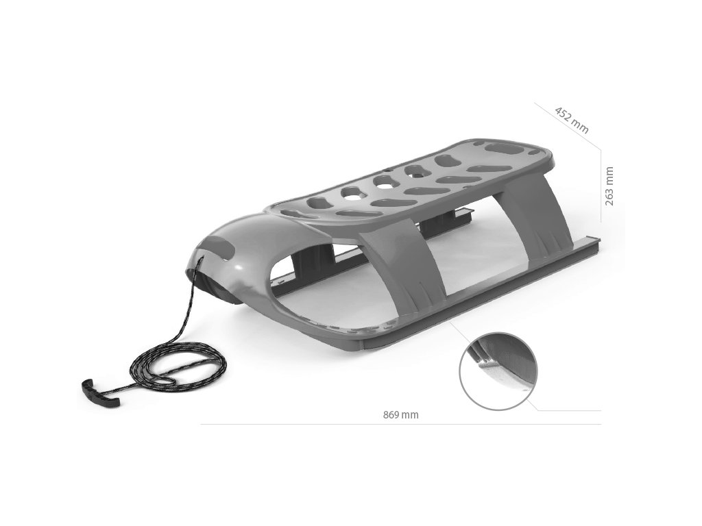 Sáně jsou vyrobené z vysoce odolného plastu a opatřené ocelovými skluznicemi, které zajišťují perfektní skluz po sněhu.