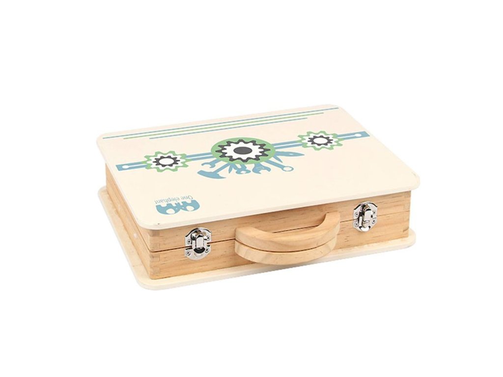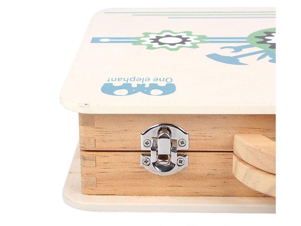 Dřevěný kufřík s nářadím je vyroben z kvalitního dřeva, které je odolné a bezpečné pro děti. Všechny části jsou pečlivě zpracovány, aby byly hladké a bez ostrých hran, což zajišťuje bezpečnost při hře.