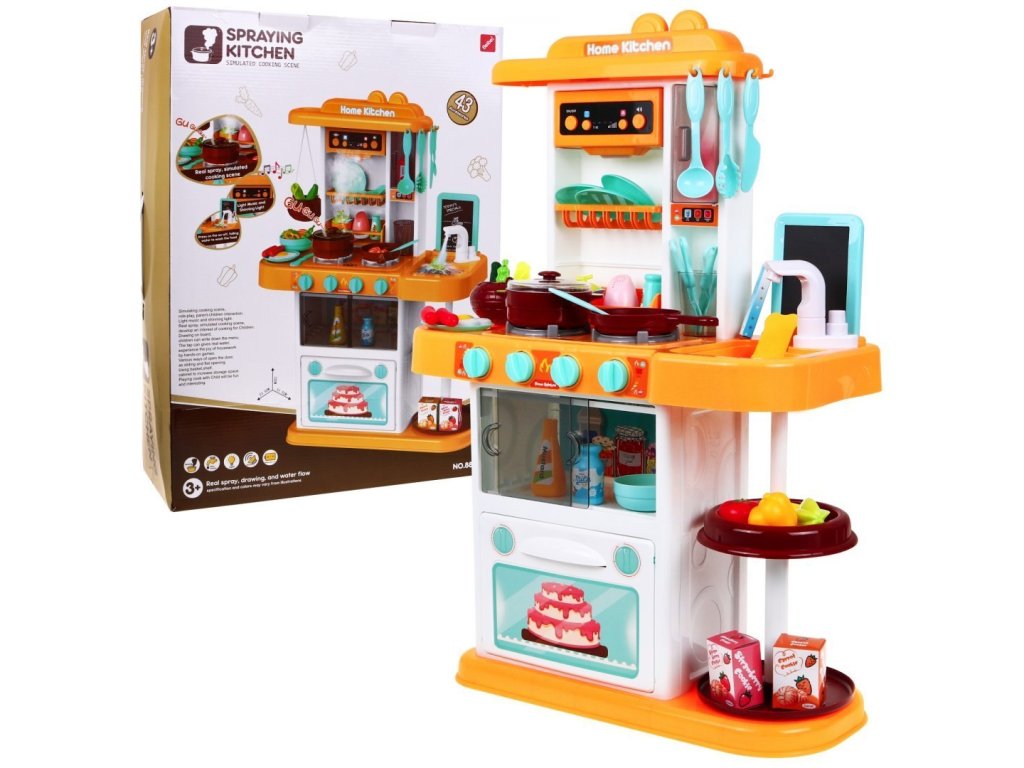 Senzační, dobře vybavená kuchyňka pro malé kuchaře a kuchařky. V kuchyňce je dřez s kohoutkem na skutečnou vodu, smyslové indukční hořáky, pohyblivé knoflíky, stříška s lampou a zvukovým panelem, otevíratelná trouba, police a mnoho kuchyňského vybavení. Hořáky vydávají zvuky a jsou doprovázeny blikajícím červeným světlem. Dalším lákadlem je pára vycházející z jednoho hořáku, napodobující vaření jídla. Celá sada se skládá ze 43 prvků. Vynikající zpracování, zářivé barvy, barevné provedení. Hračka je napájena 6xAA bateriemi, které nejsou součástí balení.