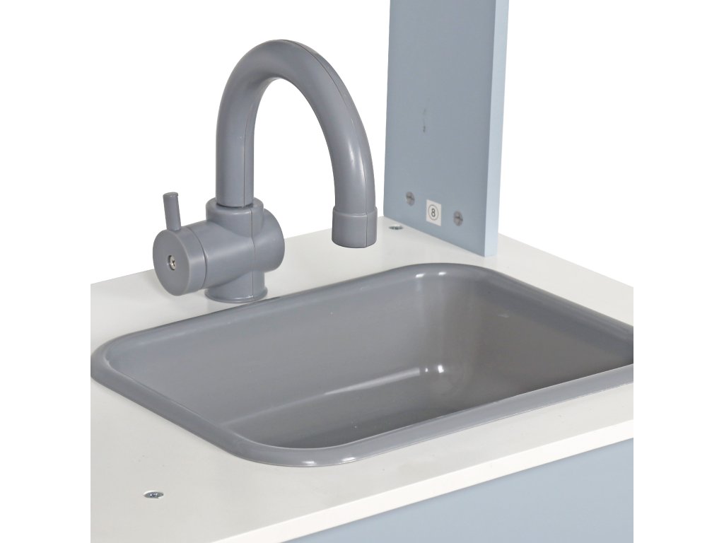 Dřez v kuchyni je vyjímatelný, takže ho dítě může naplnit vodou a po dokončení práce v kuchyni umýt nádobí.