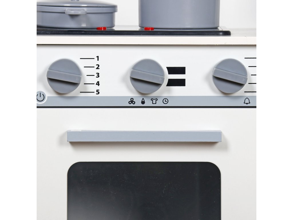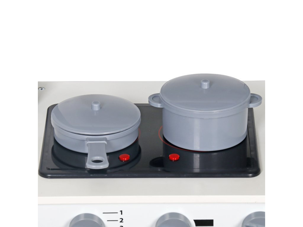 Hořáky na sporáku jsou podsvícené a vydávají zvuk vaření. Když chce dítě snížit nebo zvýšit teplotu na pečící troubě knoflíky vydávají cvakavý zvuky.