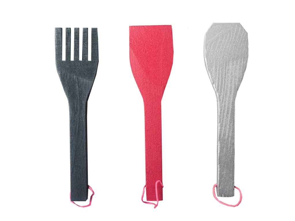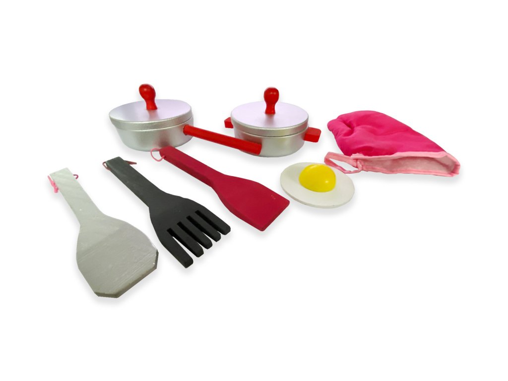 Dětské dřevěné nádobí COOKWARE SET 7, obsahuje dva hrnce, dvě obracečky, vidličku a chňapku.