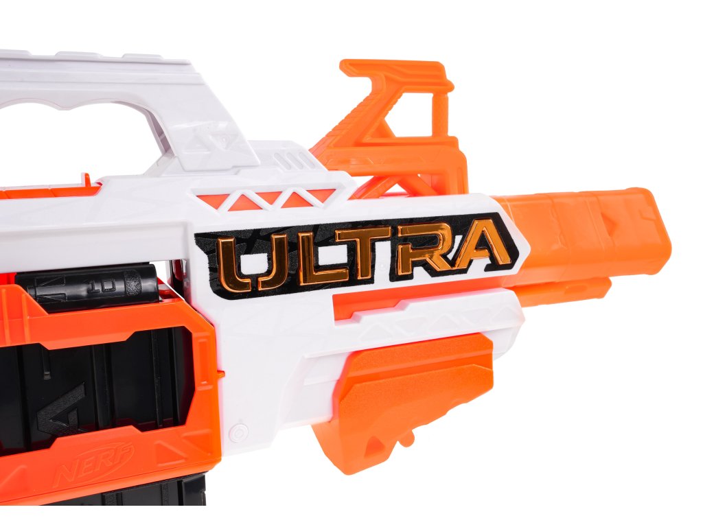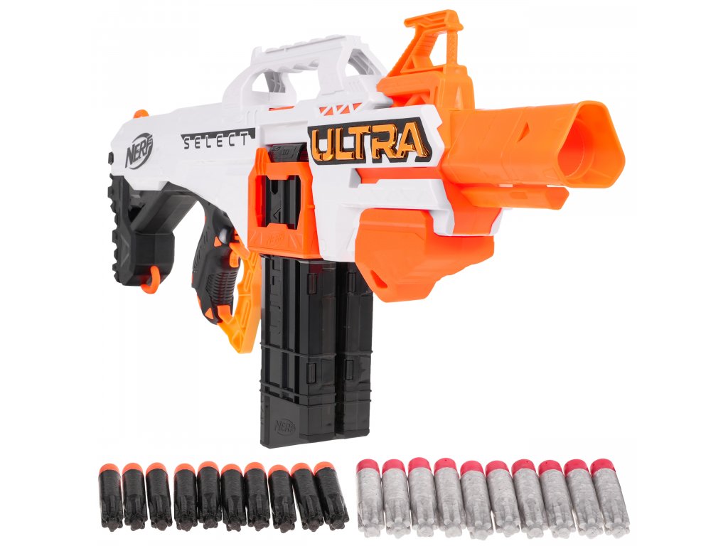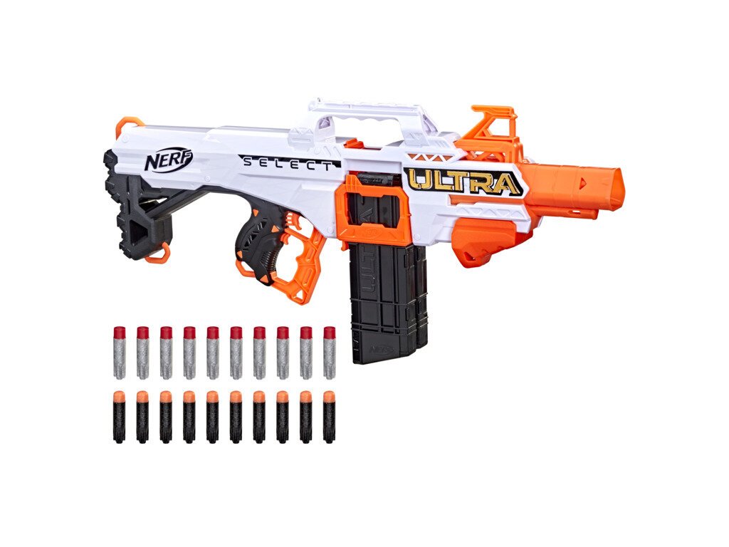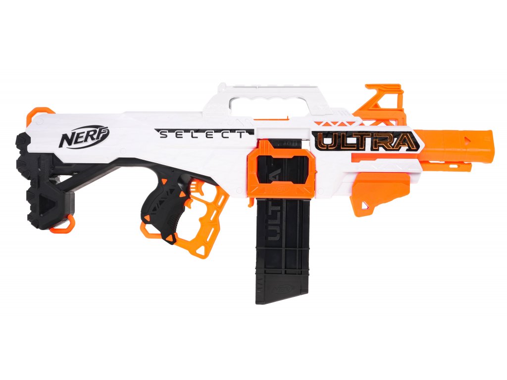 Plně automatická pistole Nerf Ultra Select pro děti od 8 let. Dětská pistole je vybavena dvěma zásobníky, do kterých se vejde 10 nábojů. Sada obsahuje celkem 20 nábojů - 10 Nerf Ultra Distance a 10 Nerf Ultra Precision. Na přední straně pistole je oranžový spínač, který nám umožňuje nastavit, jaký zásobník chceme používat. Puška je napájena bateriemi 6xC/LR14 1,5V bateriemi, baterie nejsou součástí balení.