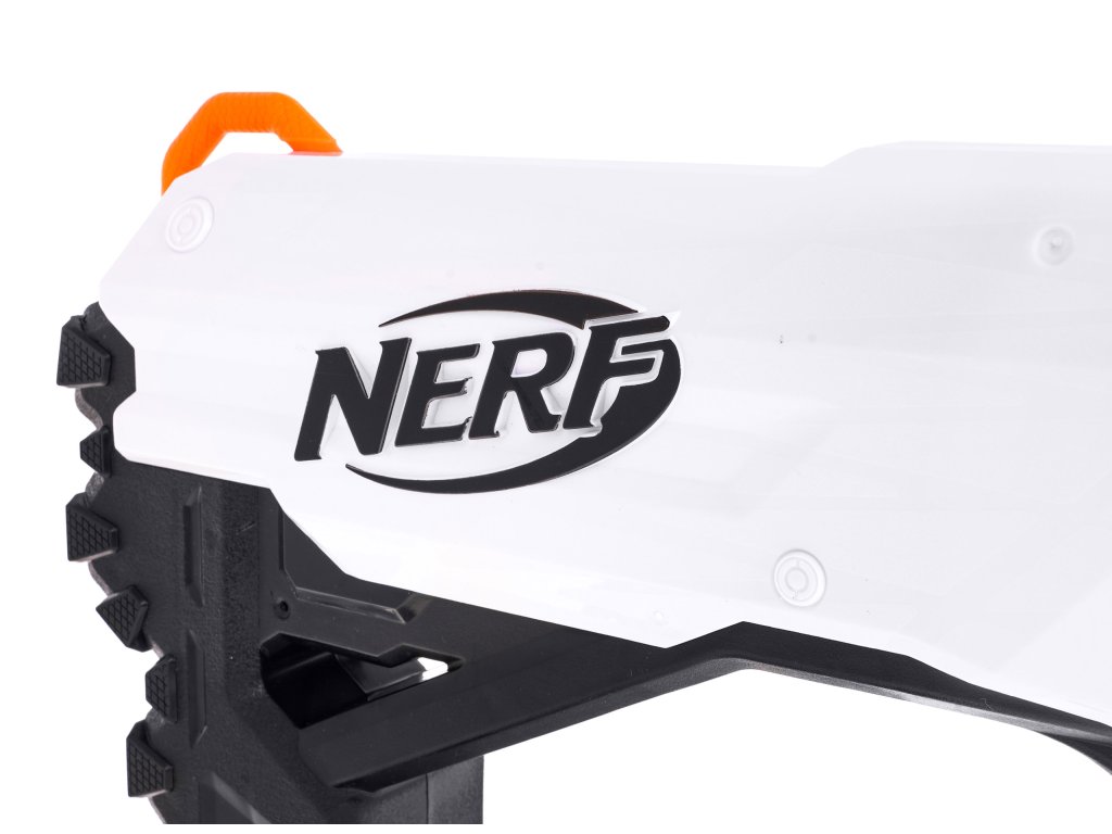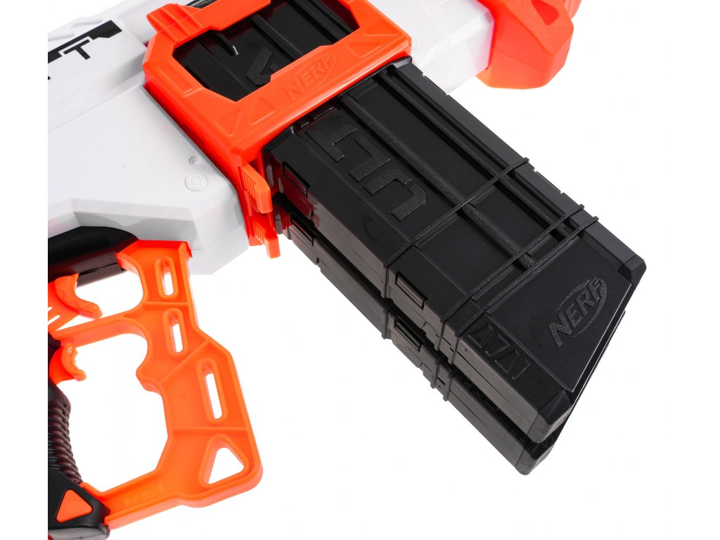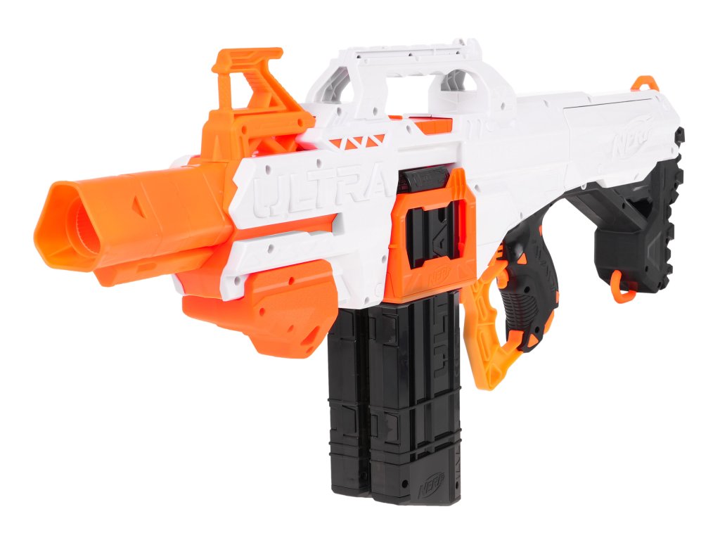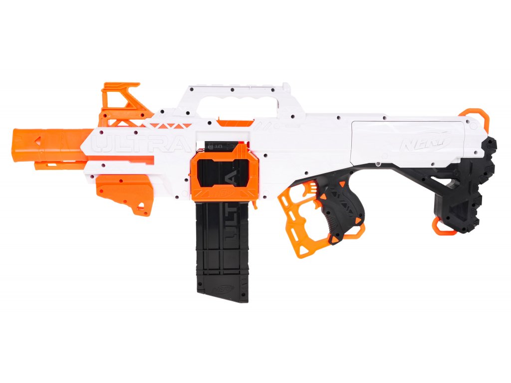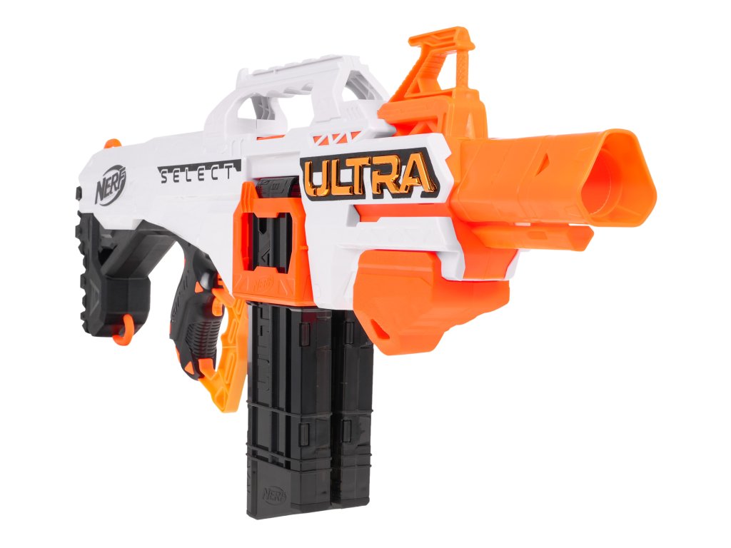 Plně automatická pistole Nerf Ultra Select pro děti od 8 let. Dětská pistole je vybavena dvěma zásobníky, do kterých se vejde 10 nábojů. Sada obsahuje celkem 20 nábojů - 10 Nerf Ultra Distance a 10 Nerf Ultra Precision. Na přední straně pistole je oranžový spínač, který nám umožňuje nastavit, jaký zásobník chceme používat. Puška je napájena bateriemi 6xC/LR14 1,5V bateriemi, baterie nejsou součástí balení.
