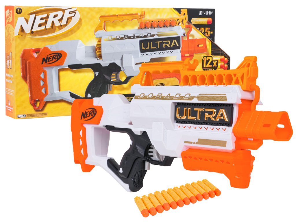 Poloautomatická pistole NERF Ultra DORADO pro děti od 8 let. Napájení pomocí 6× AA 1,5V (nejsou součástí). Pistole má otevřený bubnový zásobník na 6 pěnových šipek. Stačí naplnit buben, podržet tlačítko akcelerace a stisknout spoušť. Šipky doletí až 25 metrů, mají aerodynamický tvar pro lepší přesnost a gumovou špičku pro bezpečnější zásah. Pistole je vybavena okénkem pro odstranění zaseknutých šipek.