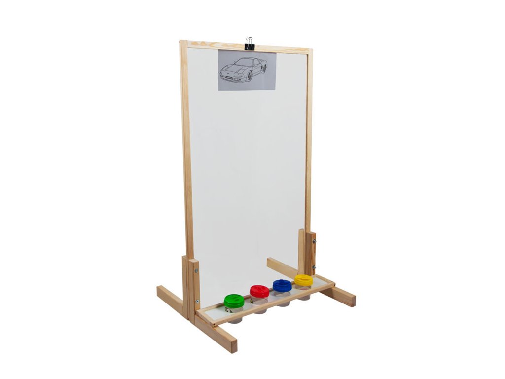 - Sada obsahuje - oboustrannou tabuli s plexisklem, kelímky na barvy umístěné na poličce, klip pro přichycení obrázku, omalovánky k obkreslení a fix