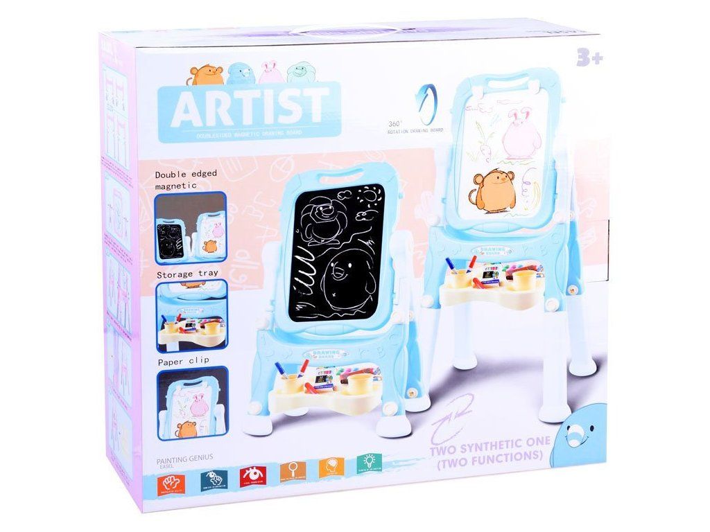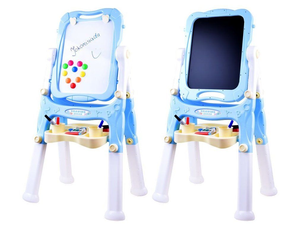 Díky otočné ploše si děti mohou vybrat mezi černou stranou pro klasické kreslení křídou a magnetickou bílou stranou. Na bílou plochu lze psát nešpinivým fixem, připevňovat magnety nebo jednoduše upevnit papír pro malování barvami. Integrovaná polička poskytuje praktické místo pro veškeré výtvarné potřeby, udržující pořádek a inspiraci vždy po ruce. Tato vzdělávací pomůcka je skvělým nástrojem pro učení prvních písmenek a číslic, stejně jako pro objevování barev.