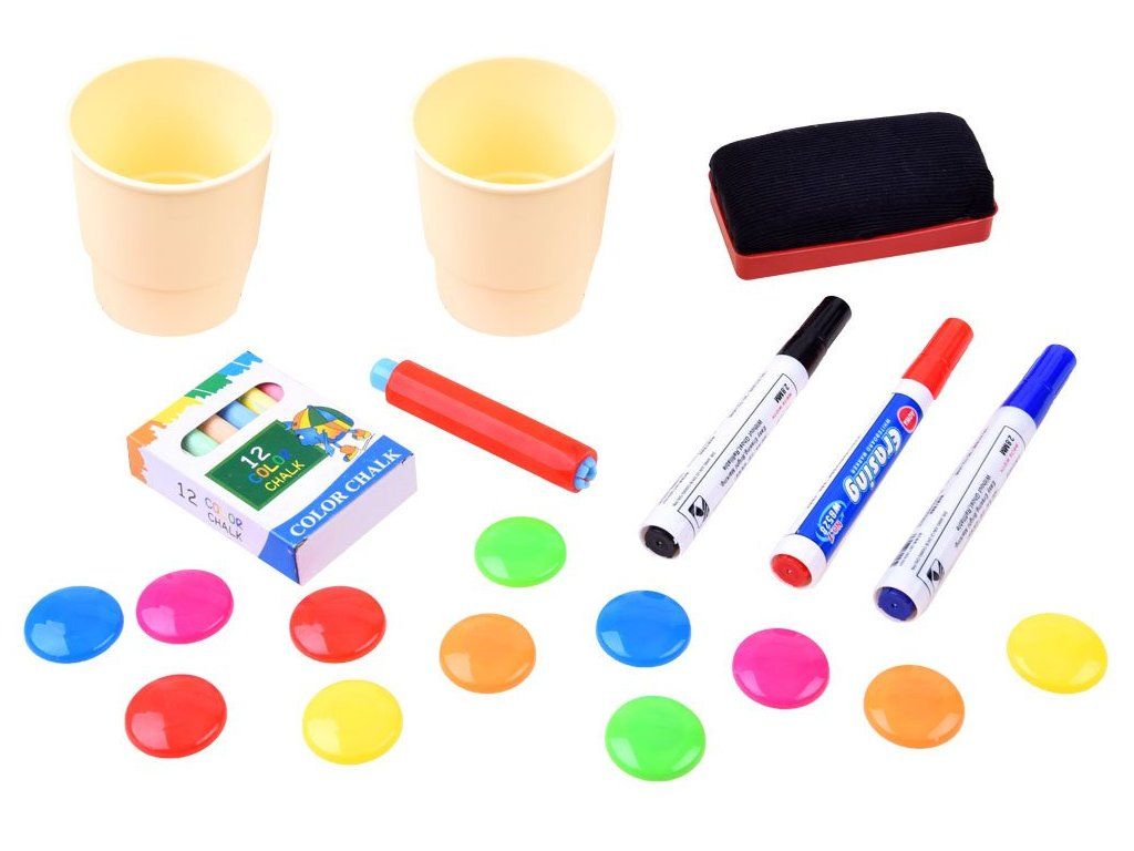 - Obsah sady: Magnetická tabule, magnety, fixy na bílou tabuli s houbičkou, houbička, barevná křída, držák na křídu, kelímky na štětce, polička na příslušenství