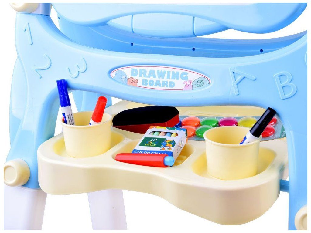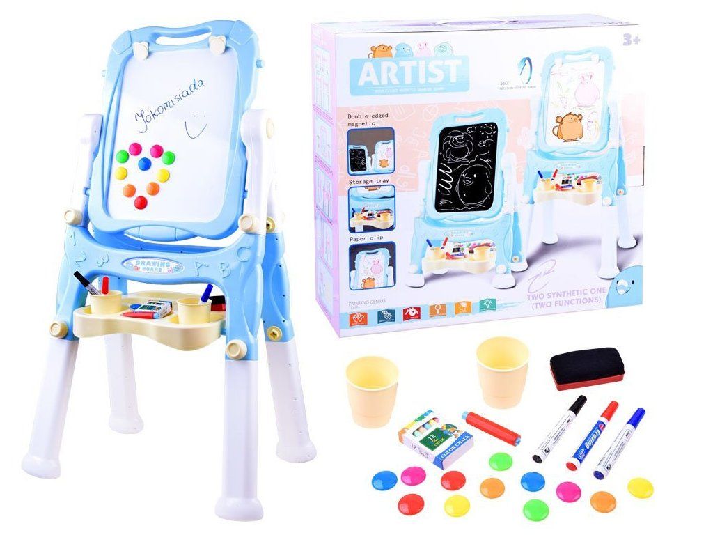 Sada obsahuje vše potřebné pro okamžité tvoření: barevné magnety, fixy na bílou tabuli s houbičkou, barevnou křídu s držákem a praktické kelímky na štětce. S celkovou výškou 108 cm a šířkou 61,5 cm poskytuje dostatek prostoru pro velké umělecké projekty. Kreslicí plocha s rozměry 30,5 x 41 cm je ideální pro malé ruce. Je to perfektní dárek pro malé umělce od 3 let, který podporuje učení hrou a rozvíjí dětskou tvořivost.