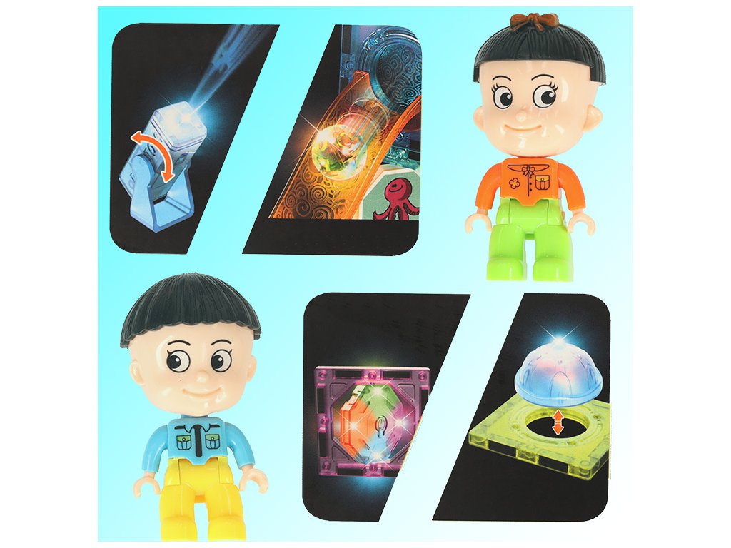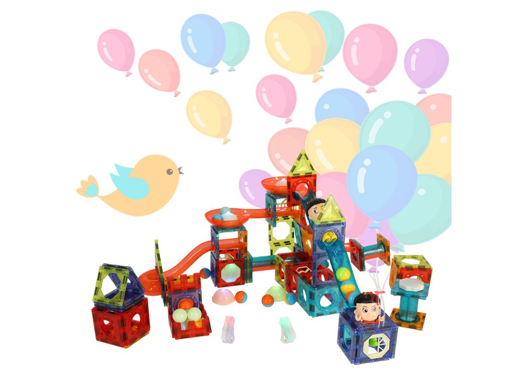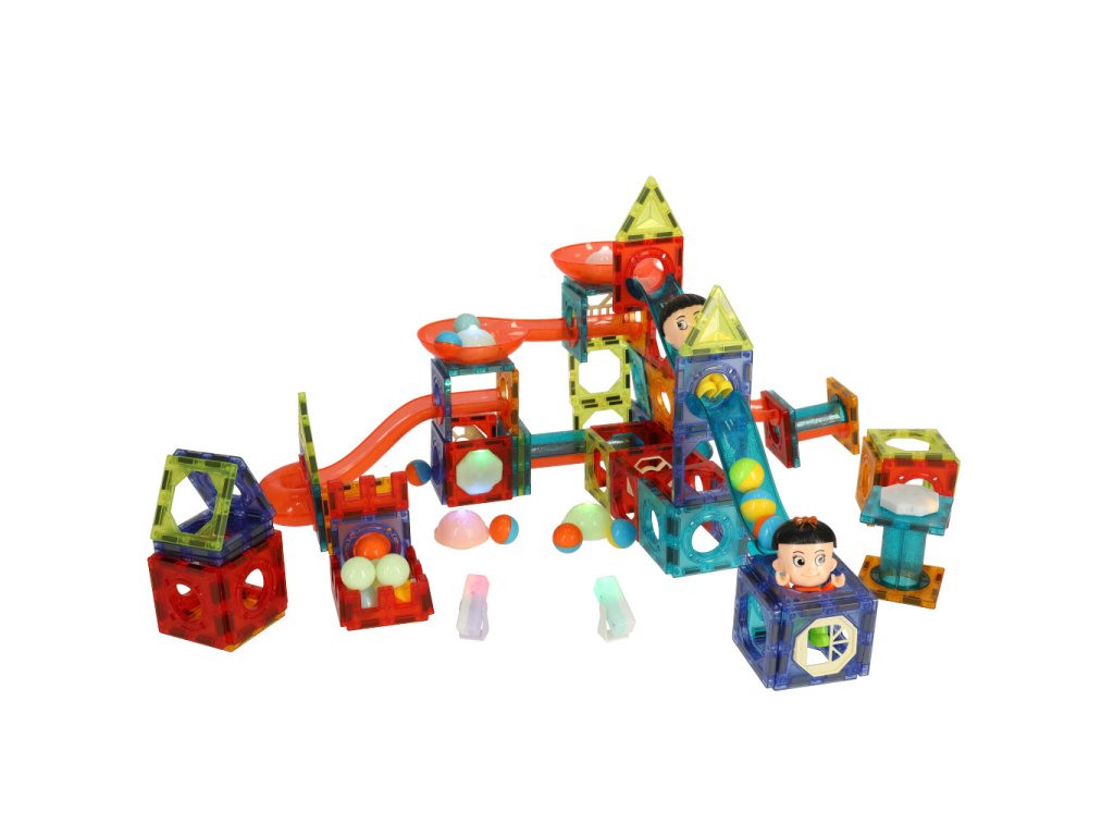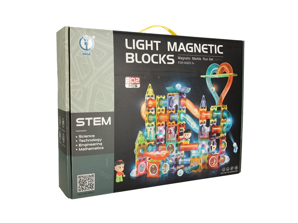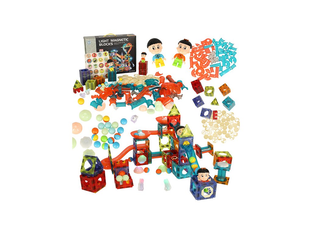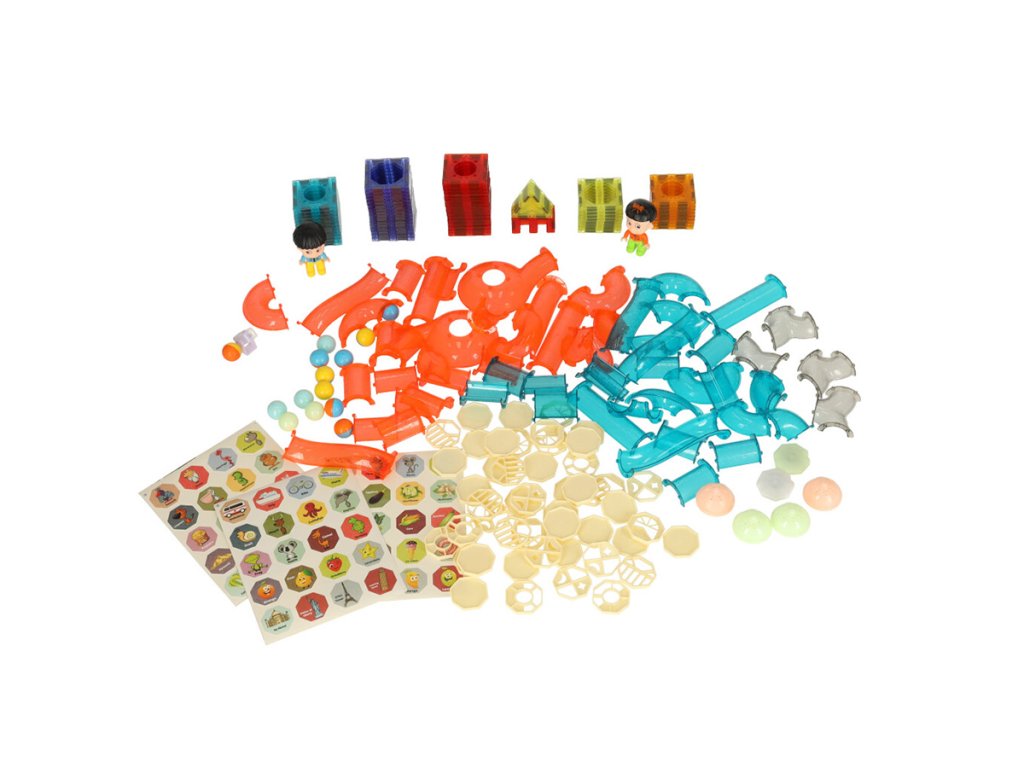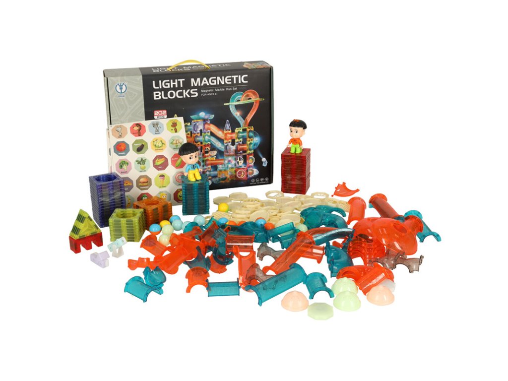 Fantastické barevné kostky, ze kterých můžete vytvořit rozmanité kuličkové dráhy! Kostky jsou velmi univerzální a umožňují stavbu různých útvarů, ať už plošných ve formě 2D tvarů, nebo prostorových staveb a kuličkových drah. Tato sada je výjimečná – obsahuje spoustu svítících prvků, včetně kuliček, které při pohybu začnou svítit. Po postavení dráhy vytvoří pohybující se kuličky krásné světelné představení! Díky reflektorům můžete podsvítit stavby a dodat jim ještě působivější vzhled, což se skvěle hodí na noční hraní. Příjemné barvy a nálepky s různými motivy povzbudí vaše dítě k zábavě. Část kostek se spojuje pomocí magnetů, čímž je stavba pevnější. Ostatní kostky sloužící jako tunely se zasouvají. Kromě svítících kuliček jsou v sadě i klasické, které mohou posloužit jako zkušební předmět před samotným světelným představením. Spojování kostek rozvíjí jemnou motoriku, přesnost a schopnost plánování stabilní konstrukce podněcuje prostorovou představivost a logické myšlení. Sledování pohybu kuliček po dráze navíc rozvíjí vizuální vnímání a pozorovací schopnosti. Sada je ideální pro společné hraní a společné plánování staveb – perfektní aktivita pro rodinný večer, která přinese zábavu, smích i posílení rodinných vazeb. Všechny prvky jsou vyrobeny z odolného plastu, takže si se sadou užijete zábavu po dlouhou dobu.