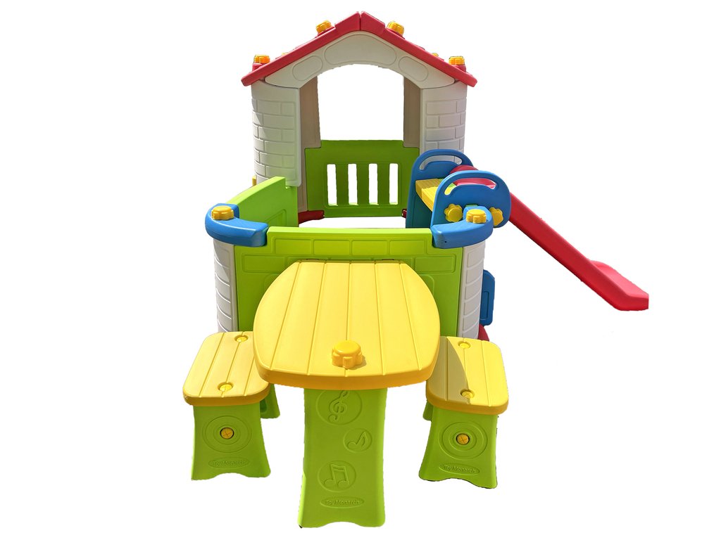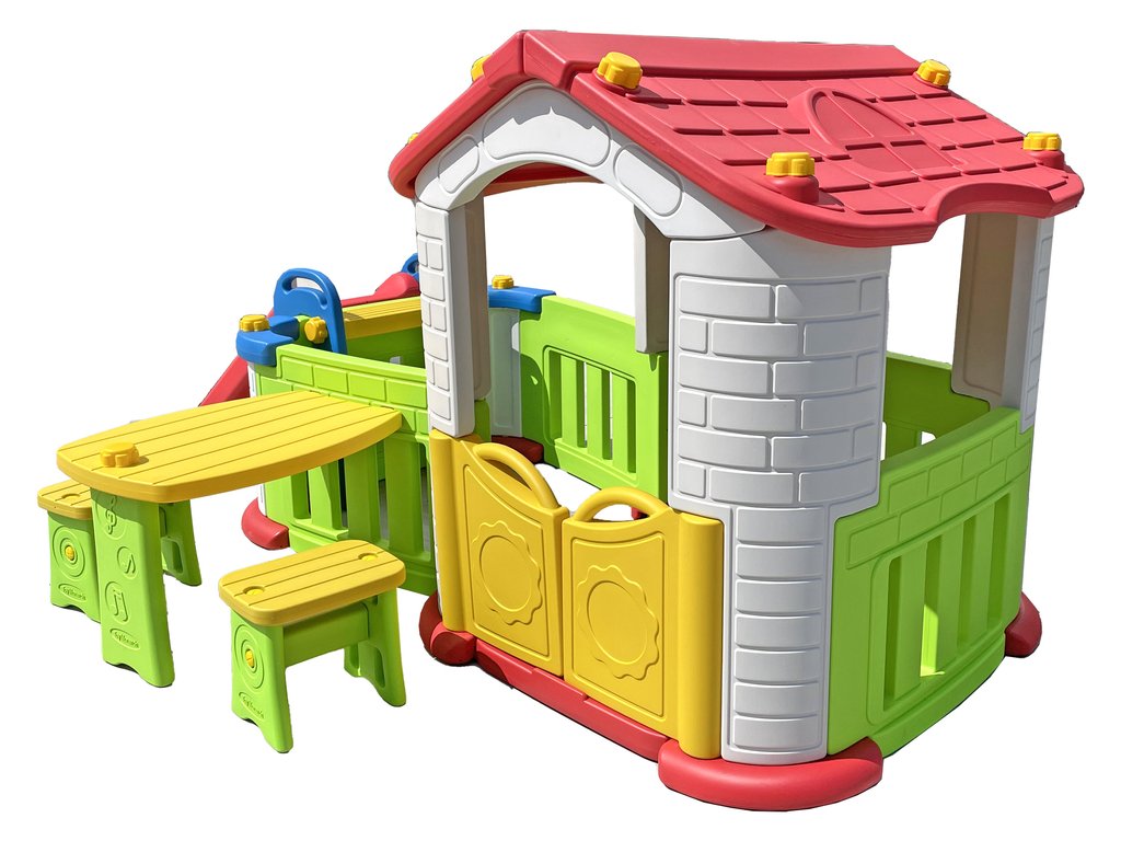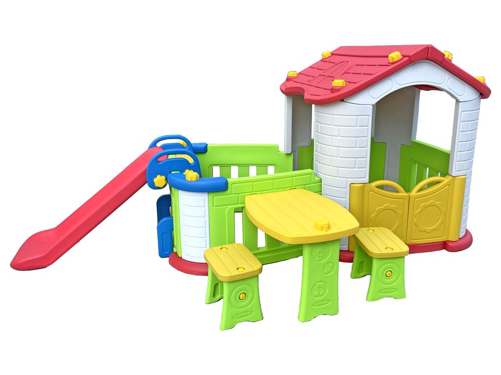 Děti budou milovat tento pohádkový domeček s prostorným interiérem a vybavenou terasou. Stěny domečku jsou odolné vůči povětrnostním vlivům a UV záření. Kvalitní zpracování hračky poskytne Vašim dětem bezpečno hru. Skluzavka může být umístěna na libovolnou stěnu domečku nebo terasy.