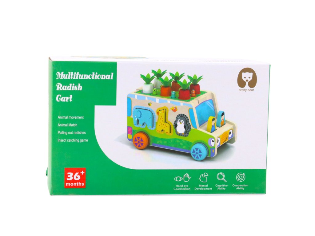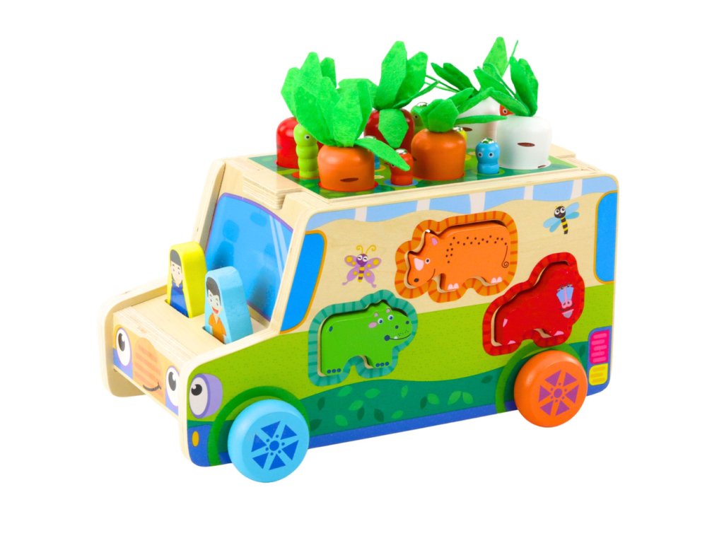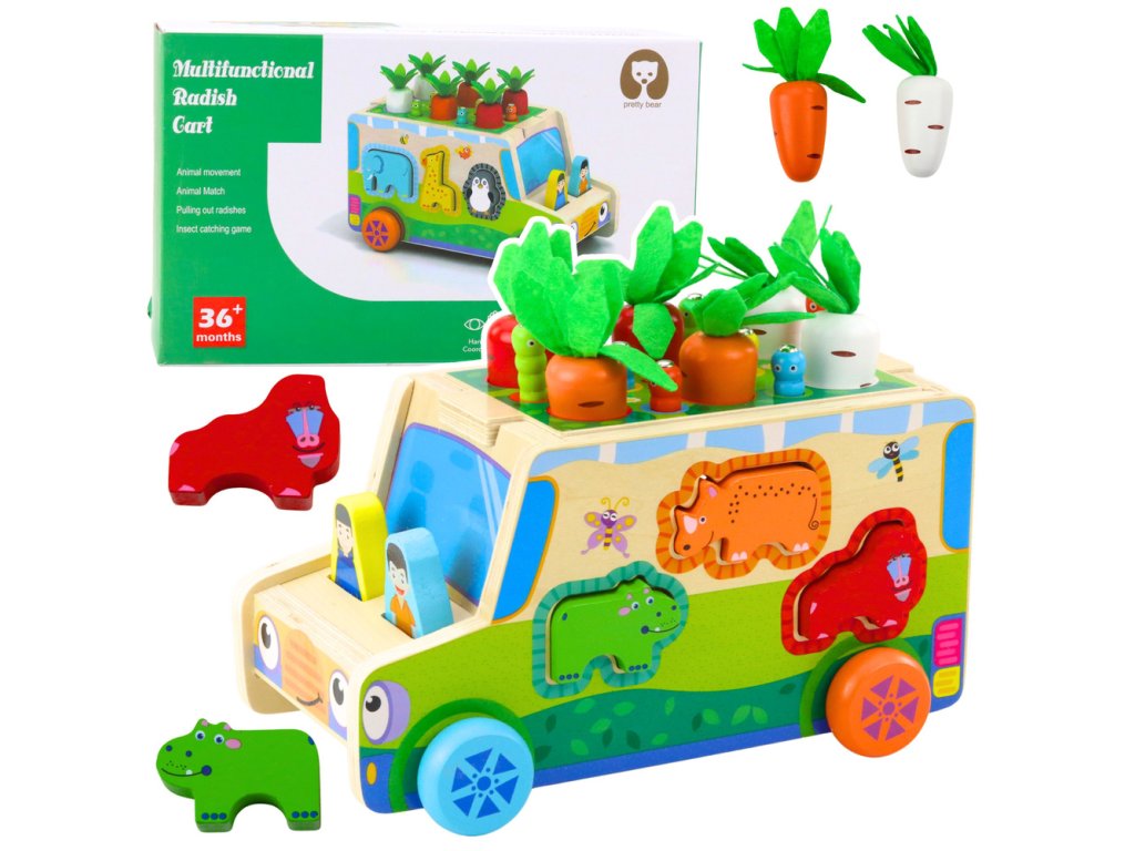 Každá strana autíčka nabízí jinou zábavu – vkládání zvířátek do otvorů sorteru trénuje přesnost a koordinaci, bludiště s posuvnými prvky rozvíjí jemnou motoriku, a zvířecí puzzle pod autíčkem podporuje pozorovací schopnosti. Další atrakcí je hra „Chyť broučka“ s magnetickými figurkami, a na střeše autíčka se skrývají barevné mrkvičky, které děti mohou vkládat a vytahovat, čímž trénují trpělivost a soustředění.