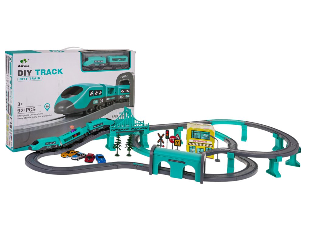 Bohatě vybavená sada vláčkodráhy s kolejemi, vláčkem a doplňky je určena pro děti od 3 let. Sada obsahuje 92 dílů, včetně trati s mostem, tunelem, stanicí, supermarketu, dopravních značek, 4 aut a figurky. Vláček je napájen 2× AAA bateriemi (není součástí) a vagóny se spojují pevnými magnety. Vše je vyrobeno z kvalitního plastu v živých barvách, které přitahují dětskou pozornost.