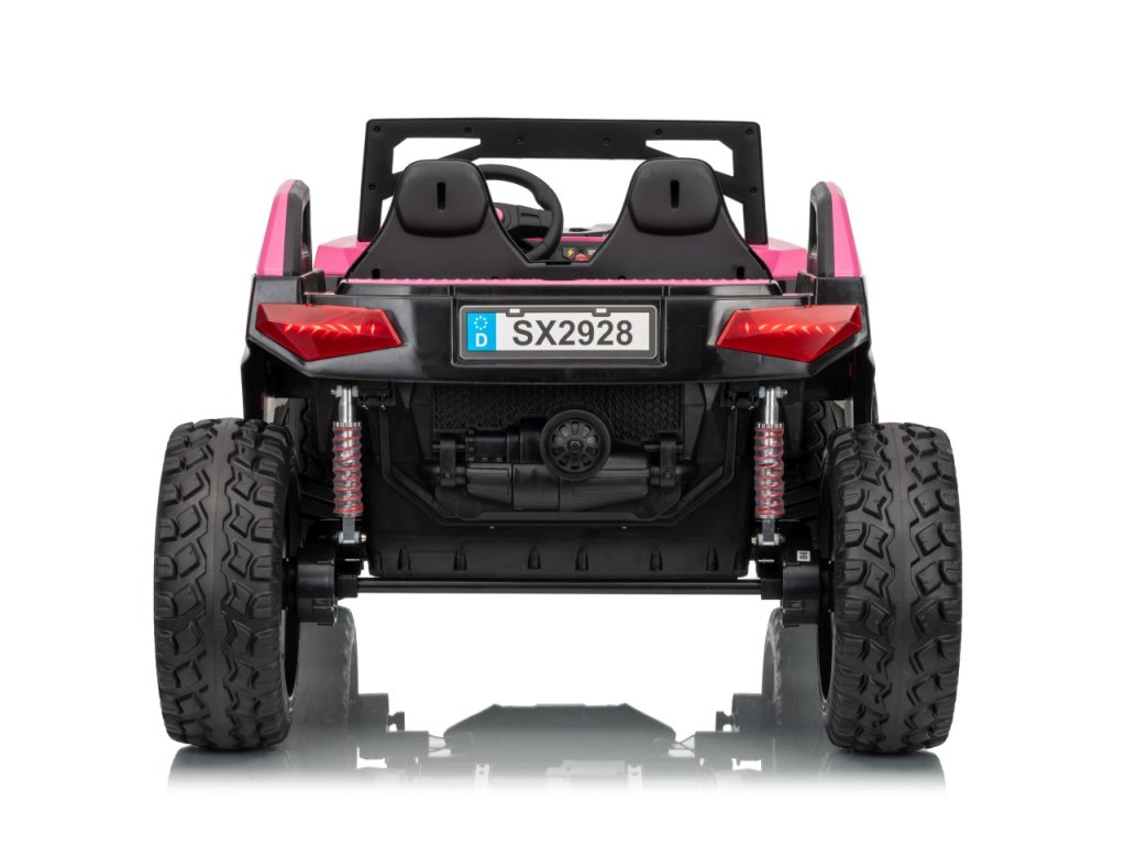 Toto elektrické autíčko pro děti zaujme nejen svým moderním designem, ale především výkonem a výbavou, která se vyrovná skutečným vozidlům. Díky pohonu 4x4 (2×45 W vpředu + 2×300 W vzadu) a nastavitelnému zadnímu odpružení zvládne i náročnější terén a poskytne hladkou a bezpečnou jízdu. O pohodlí se stará dvojité sedadlo z černé odvětrávané ekokůže, bezpečnost zajišťuje dálkové ovládání 2,4 GHz s bezpečnostním tlačítkem Stop a plynulým rozjezdem. Díky EVA kolům má auto výbornou stabilitu a tichý chod. LED světla vpředu i vzadu, osvětlená kapota a spínač světel dodávají realistický vzhled. Malí řidiči ocení bohatý audio panel – MP3, SD, AUX, USB, FM rádio, Bluetooth i přednastavené melodie. Vozidlo se jednoduše startuje tlačítkem, dveře se otevírají se zámkem a díky velké světlé výšce 23 cm si poradí i s nerovnostmi. Celková nosnost je až 60 kg. Napájení zajišťuje baterie 2× 12 V/14 Ah (řada 24 V), která poskytuje dostatek energie pro dlouhou jízdu.