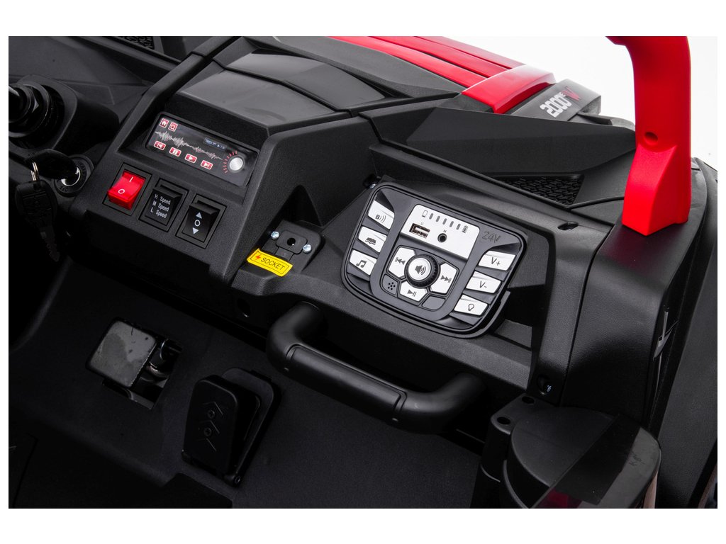 Bezpečnost je na prvním místě, proto je autíčko vybaveno bezpečnostními pásy a automatickou brzdou, která se aktivuje ihned po uvolnění plynového pedálu, což rodičům dodává klid. Pohodlné sedadlo z ekokůže a přední LED světla přidávají na komfortu a realistickém pocitu z jízdy. Díky výkonné 24 V 14 Ah baterii si děti užijí jízdu po dobu 1–2 hodin na jedno nabití. Autíčko nabízí automatickou převodovku se 3 rychlostmi, což umožňuje plynulou a vzrušující jízdu rychlostí až 13–15 km/h. Vstup pro MP3 zvuky z USB pak umocní zážitek z jízdy oblíbenou hudbou nebo zvuky.