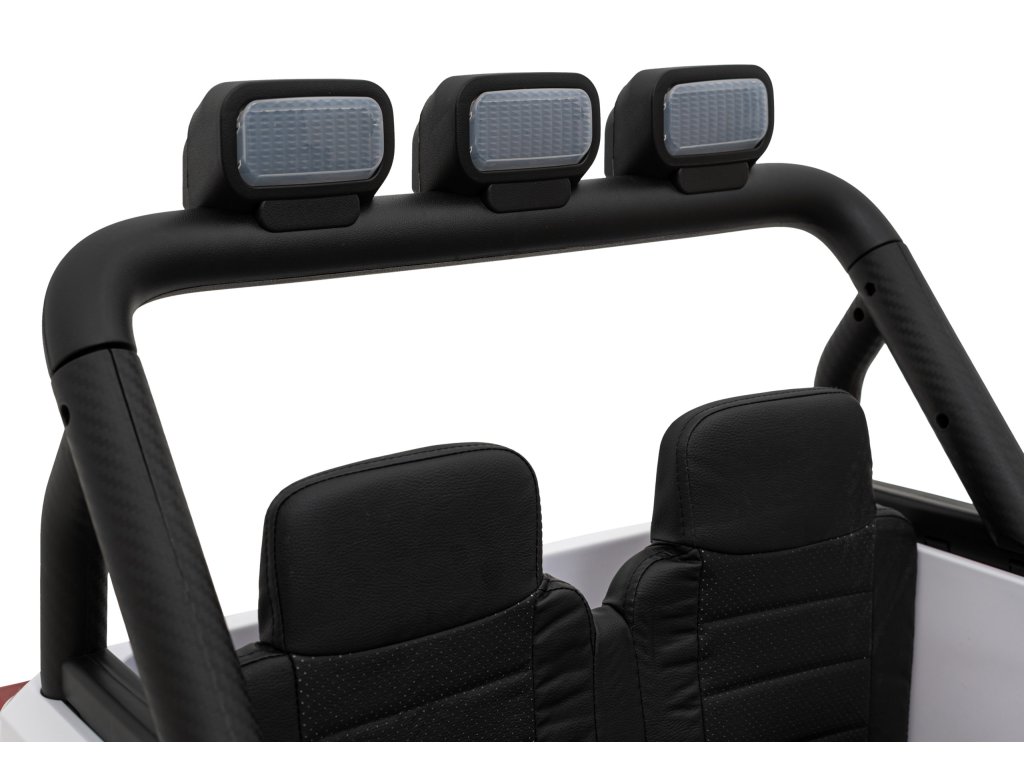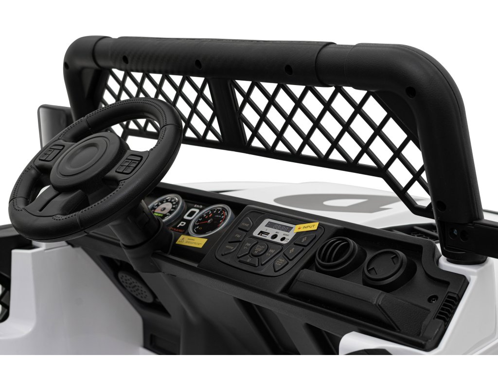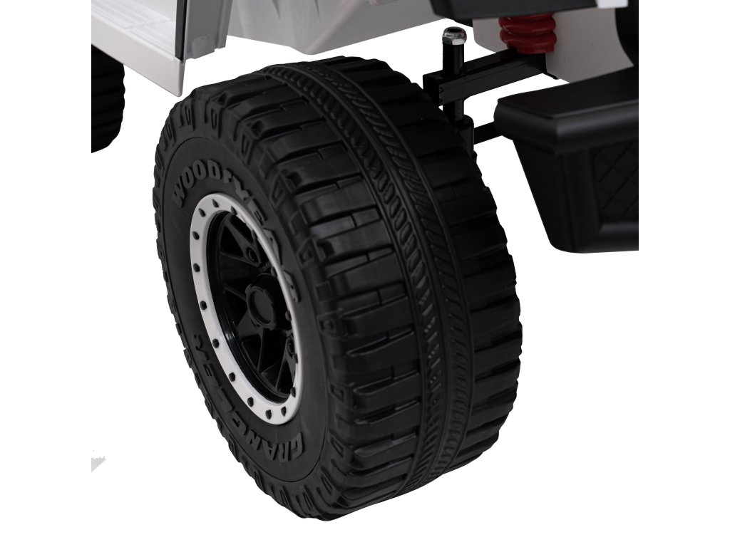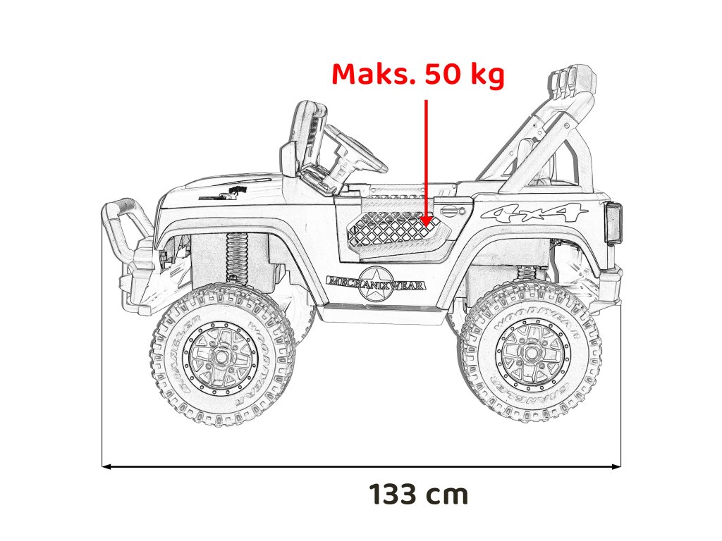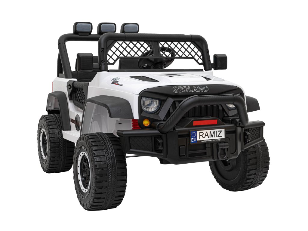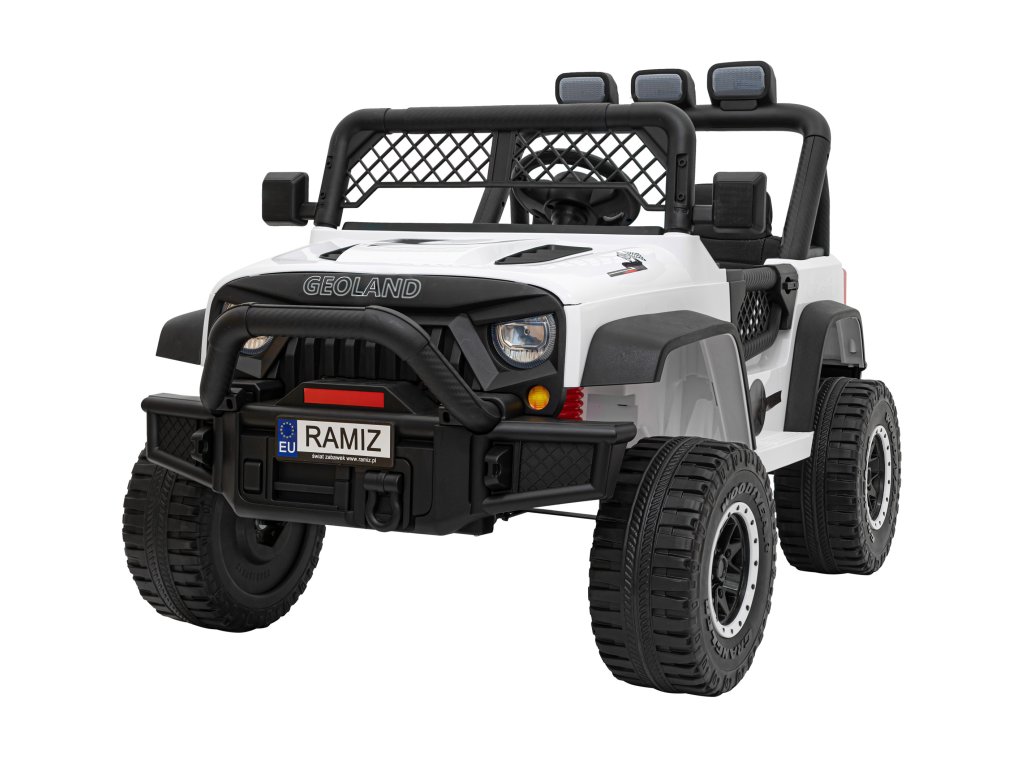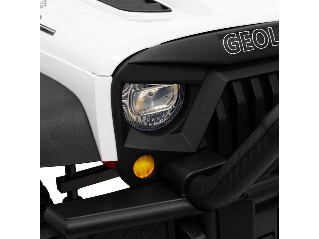 Elektrické autíčko jeep Geoland Power je vybaveno motorem o výkonu 2x200W a baterií s výkonem 24V/7Ah. Autíčko můžete ovládat dálkovým ovládáním, které má 3 rychlosti a bezpečnostní tlačítko zastavení. Pohodlnou jízdu zajistí kolečka z EVA pěny a sedadlo z ekokůže. Bezpečnost je zajištěna pomocí bezpečnostních pásů, bezpečné nastupování je zajištěno otevíráním dveří. Na cestě autíčko bude dobře vidět díky předním a zadním LED světlům. Pokud během jízdy rádi posloucháte hudbu, můžete si přehrát pomocí zabudovaného audio panelu formáty MP3, USB, AUX, nahrané melodie a tlačítka zvuku a klaksonu na volantu.