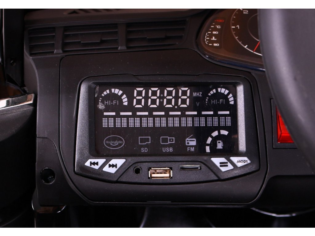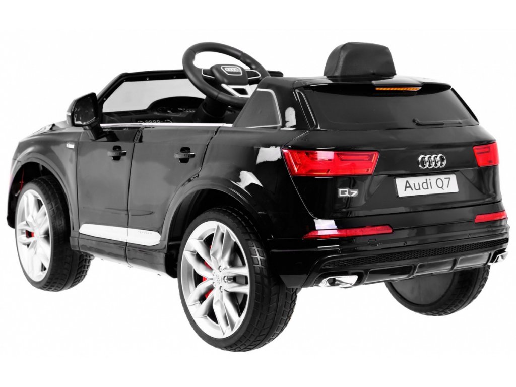 Nový model Audi Q7 přináší řadu senzačních inovací. Dva silné, elektrické motory (2x 45W / 12V) se starají o náhon obou zadních kol, díky čemuž je autíčko vhodné i pro řádění v terénu. Jízda na 3 rychlostní stupně vpřed a 3 vzad. Vozítko je možné ovládat dvěma způsoby - manuálně a dálkovým ovládáním. Při manuálním řízení se autíčko rozjede stisknutím nožního pedálu, po uvolnění pedálu autíčko samo zabrzdí. S řízením si tak bez problémů poradí i ti nejmenší, začínající řidiči. Nový 2.4G bluetooth dálkový ovladač má před manuálním řízením přednost - autíčko je možné zabrzdit i při stlačeném pedálu. Nad vozítkem tak máte plnou kontrolu. Audi Q7 NEW je vybavená senzačním LED osvětlením - denní svícení, svítící přední a zadní světla, mlhovky, osvětlené palubní přístroje, svítící stupeň zařazené rychlosti a LED display s voltmetrem. Nesmí chybět ani zvukové efekty jako klakson, zabudovaná muzika, zvuky motoru, startování a další. Pro ještě větší zážitek z jízdy je autíčko vybavené funkčním FM rádiem a vstupy pro MP3, USB a SD (paměťovou) kartu, díky čemuž je v autíčku možné přehrávat hudbu například z flashky. Hlasitost zvukových efektů je možné regulovat, stejně tak lze zvuky i osvětlení vypnout. Autíčko má otvíratelné dveře. Gumová kola z měkčeného EVA materiálu a odpružení přední i zadní nápravy zajišťují příjemnou jízdu. Pohodlná, koženková sedačka je opatřená stavitelným bezpečnostním pásem. Kromě občasného mytí a dobíjení nevyžaduje autíčko žádnou jinou údržbu.