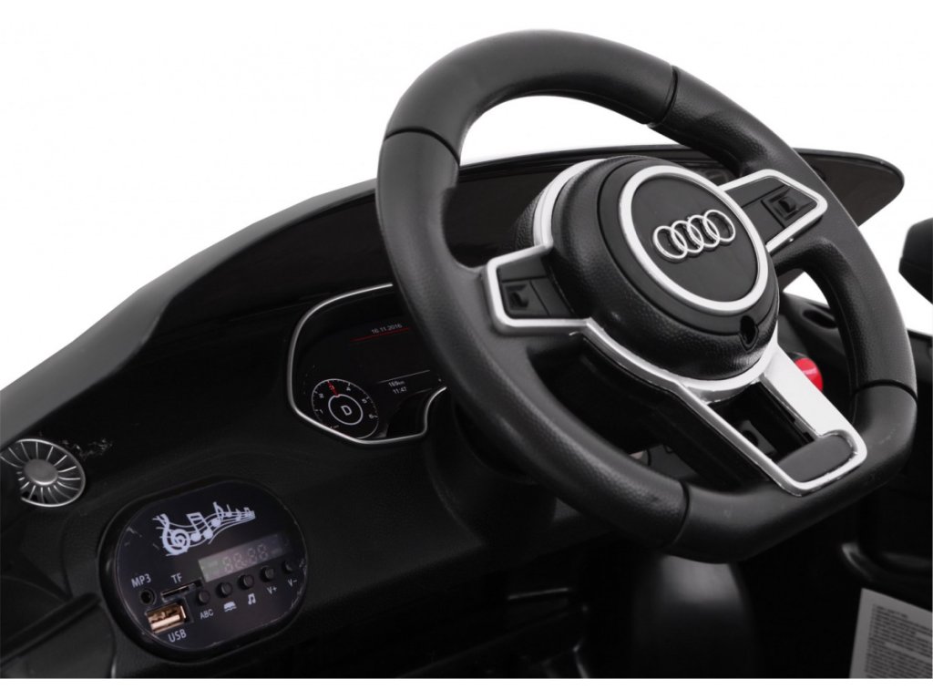 Autíčko Audi TT RS s realistickým vzhledem, originálními detaily, znaky, funkčními předními a zadními světly. Autíčko má koženou sedačku a otvírací dveře. Autíčko je také vybaveno svítícími světly s originální optikou. Pro malé hudební nadšence je k dispozici vstup pro MP3 a USB. Digitální ukazatel stavu a nabití baterií, pro bezpečnost dítěte je na sedačce nastavitelný bezpečnostní pás.