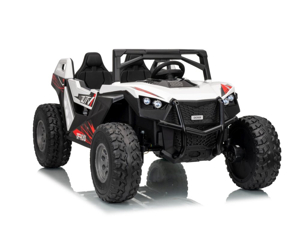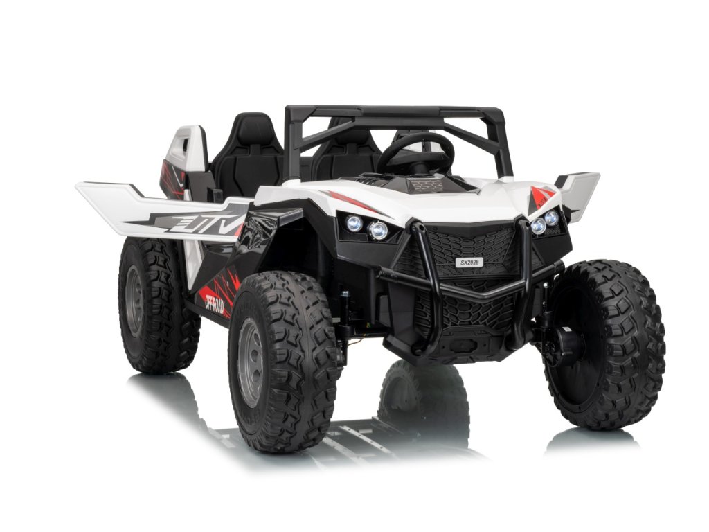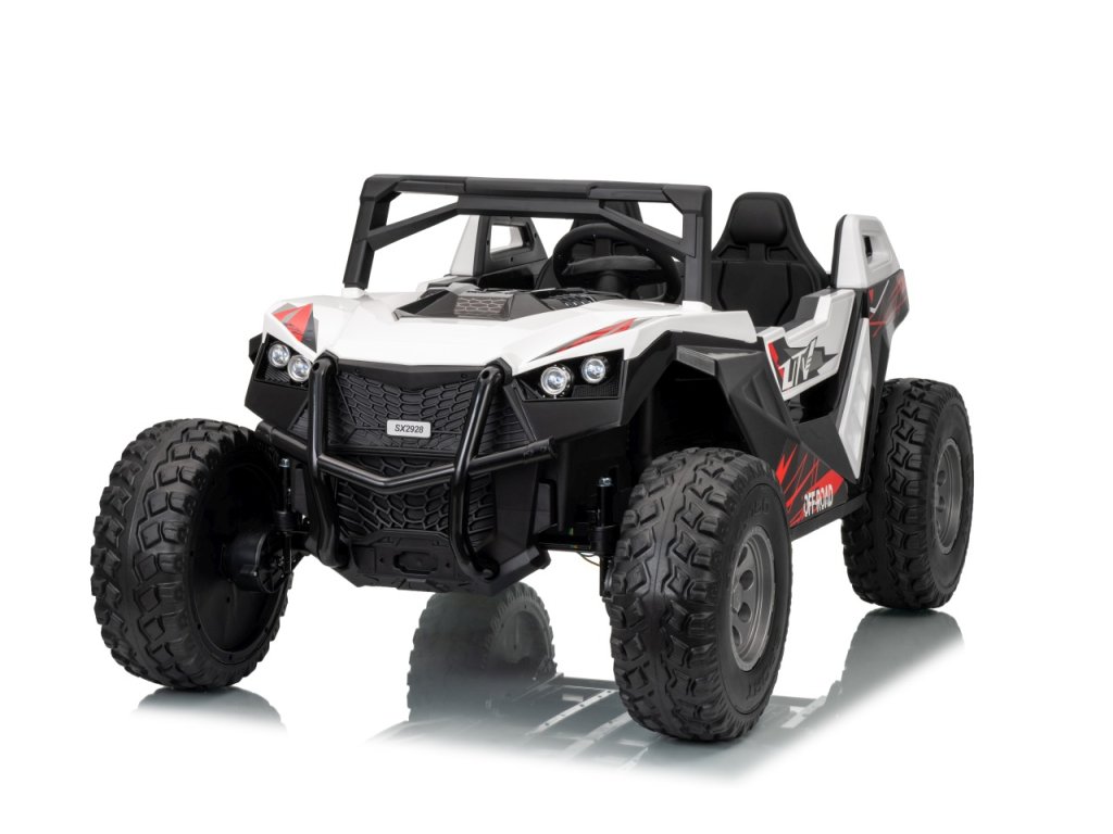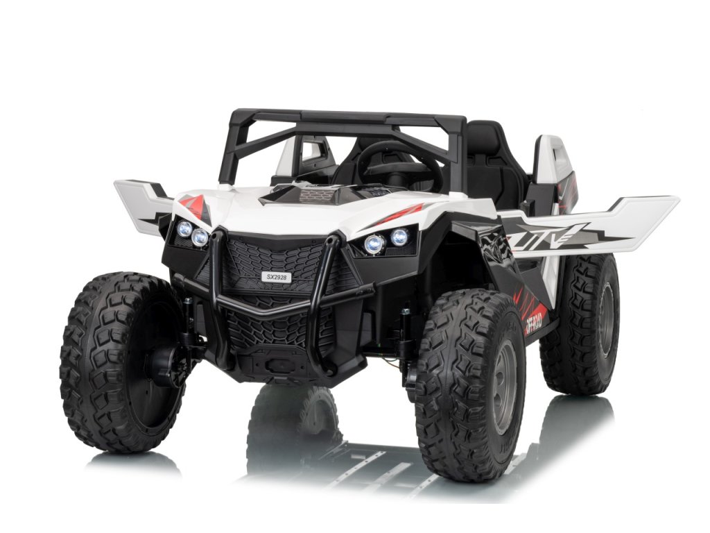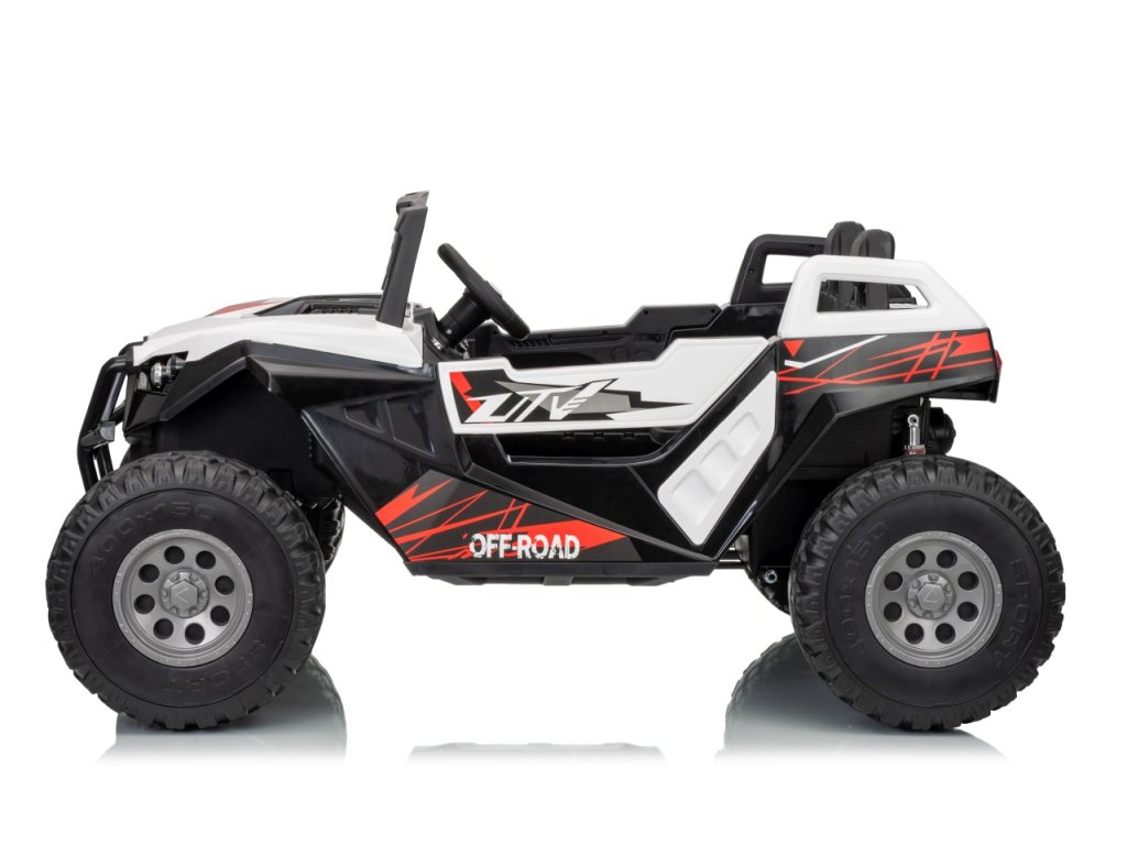 Toto elektrické autíčko pro děti zaujme nejen svým moderním designem, ale především výkonem a výbavou, která se vyrovná skutečným vozidlům. Díky pohonu 4x4 (2×45 W vpředu + 2×300 W vzadu) a nastavitelnému zadnímu odpružení zvládne i náročnější terén a poskytne hladkou a bezpečnou jízdu. O pohodlí se stará dvojité sedadlo z černé odvětrávané ekokůže, bezpečnost zajišťuje dálkové ovládání 2,4 GHz s bezpečnostním tlačítkem Stop a plynulým rozjezdem. Díky EVA kolům má auto výbornou stabilitu a tichý chod. LED světla vpředu i vzadu, osvětlená kapota a spínač světel dodávají realistický vzhled. Malí řidiči ocení bohatý audio panel – MP3, SD, AUX, USB, FM rádio, Bluetooth i přednastavené melodie. Vozidlo se jednoduše startuje tlačítkem, dveře se otevírají se zámkem a díky velké světlé výšce 23 cm si poradí i s nerovnostmi. Celková nosnost je až 60 kg. Napájení zajišťuje baterie 2× 12 V/14 Ah (řada 24 V), která poskytuje dostatek energie pro dlouhou jízdu.