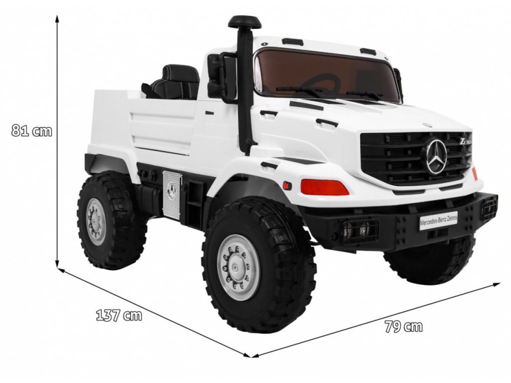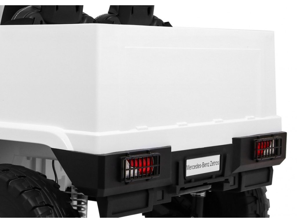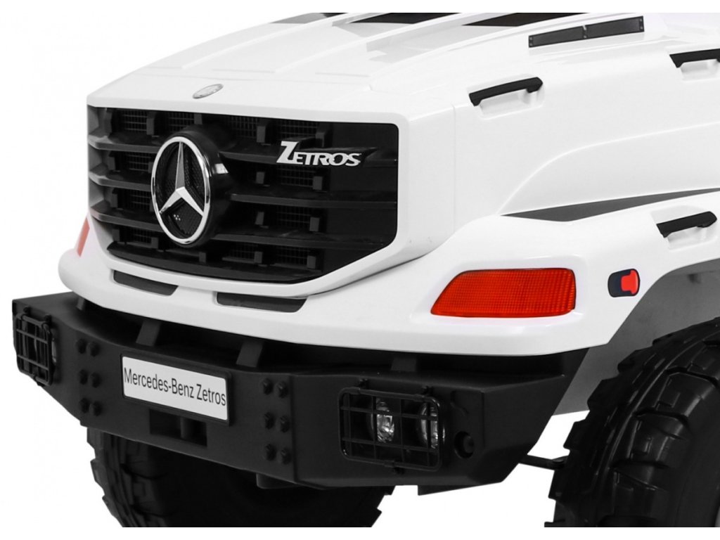 Elektrické autíčko Mercedes-Benz ZETROS má pěnová Eva kola s ložisky, pro pohodlnou jízdu. Autíčko je opatřeno zesílenémi zadními tlumiči. Dále má auto dvě samostatná pohodlná sedadlo z černé eko-kůže vybavené 3-bodovým bezpečnostním pásem. Zvukový panel je vybaven MP3, vstupem AUX, vstupem SD karty, FM rádiem a veselými písněmi. Kufr auta se nachází v zadní části. Vzadu vozidla se nachází transportní kovová rukojeť pro přenos auta. Součásti je plachta na přikrytí auta, USB flash disk, který obsahuje instruktážní video. Dále je součásti návod + montážní sada, nabíječka s diodou, která ukazuje nabíjení baterie.