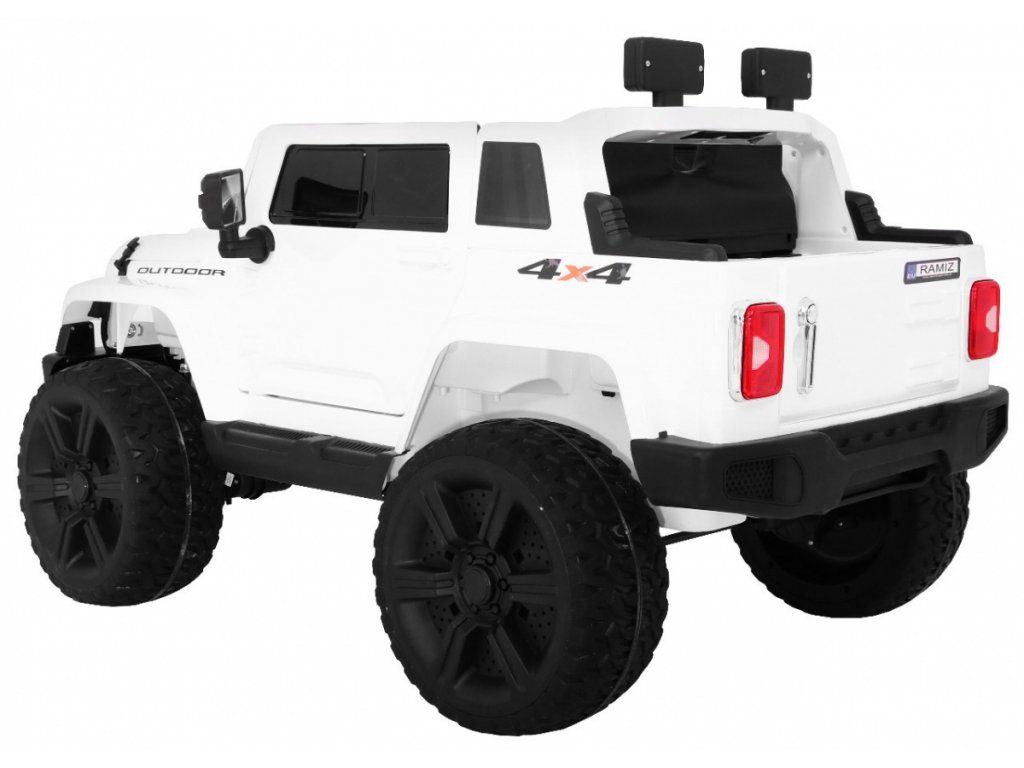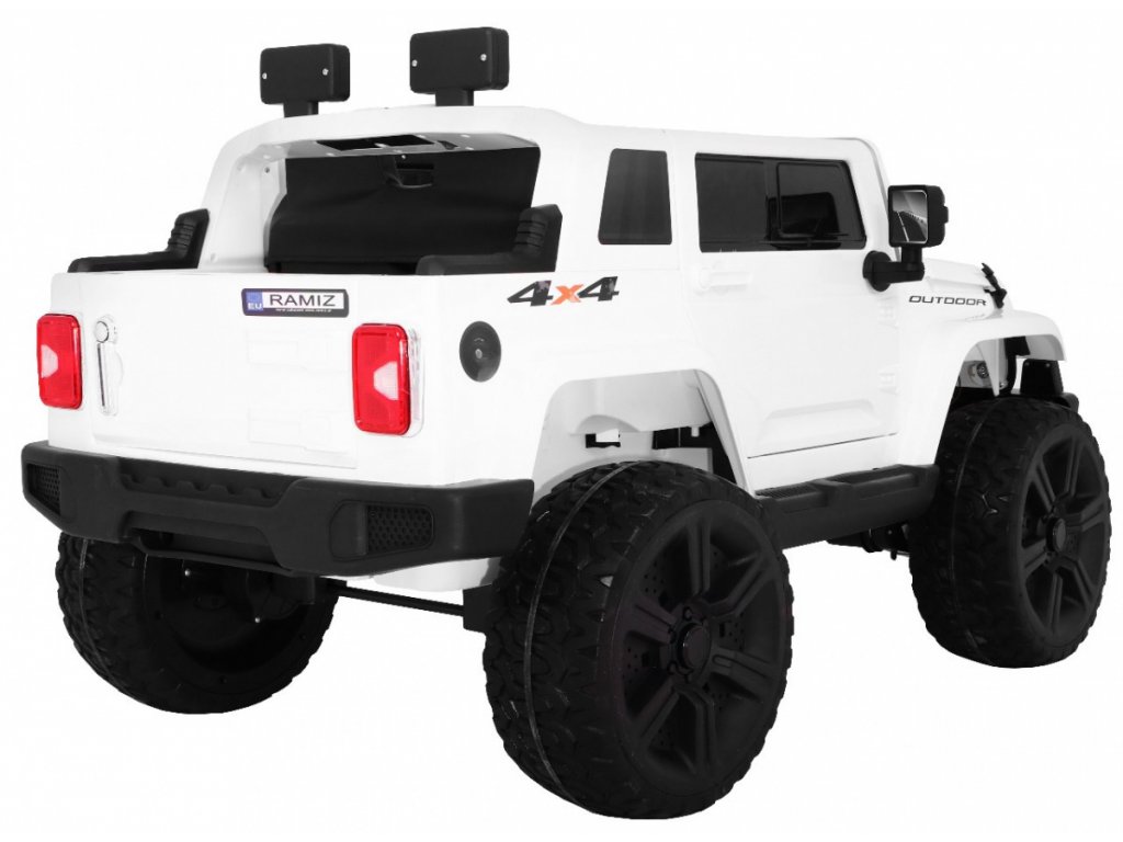 Jeep Mighty 4x4 je elektrické autíčko vybavené zvukovými a světelnými efekty. Autíčko má otevírací dveře, měkké sedadlo. Auto je vybaveno dálkovým ovládáním, pomocí něhož můžete řídit směr a bezpečnost jízdy Vašeho dítěte. Autíčko má přední, zadní i horní LED osvětlení, které poskytují fantastické světelné efekty a uspokojí každého mladého řidiče. Kolečka jsou vyrobena z měkkého plastu EVA, které zajistí komfortní jízdu. Díky hudebnímu panelu si může řidič vybrat mezi poslechem hudby (veselých písní) nebo skladbami z MP3. Součástí autíčka je návod k používání a návod ke složení autíčka. Dále je v balení plachta na vozidlo a MiniJack kabel. Autíčko má otevírací dveře, které se otevírají z vnitřní části vozidla.