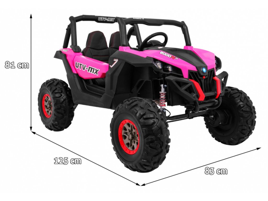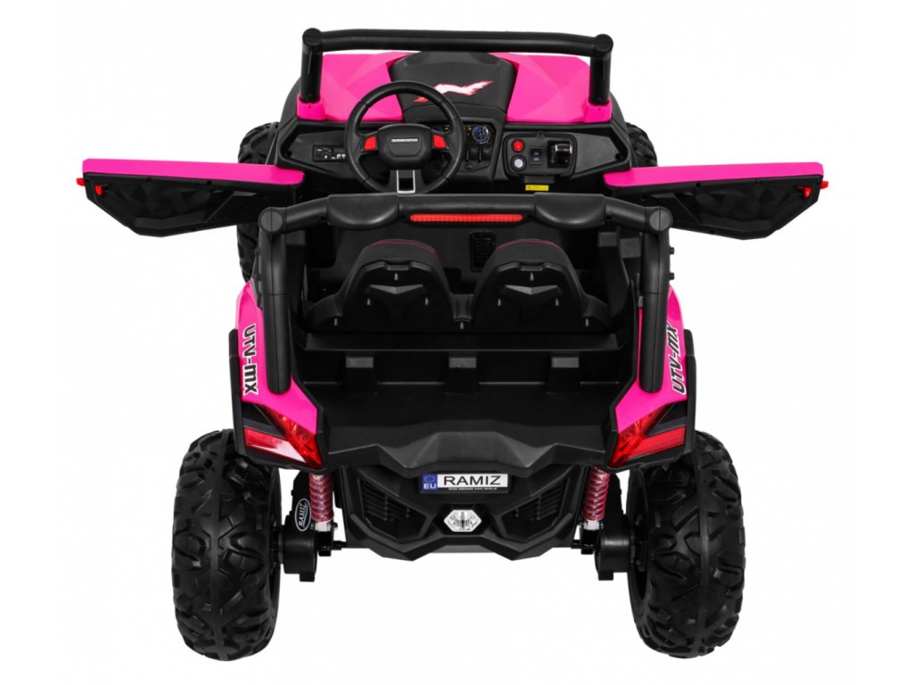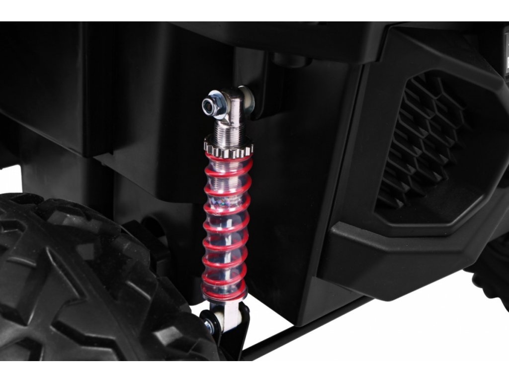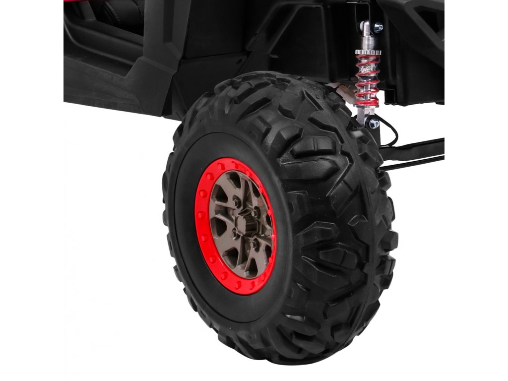 Tato velká dvoumístná bugina 4x4 má nádherný vzhled terénního vozidla, kvalitní materiály a zpracování. Má otvírací dveře, jezdí vpřed/vzad na nožní pedál, velký LCD displej pro přehrávání videa, nebo se ovládá dálkovým ovladačem se 3 rychlostmi vpřed, 3 vzad, pravá/levá, s přednostní jízdou nad pedálem tzn. dítě můžete ovladačem zastavit. Jízda vpřed/vzad se ovládá řadící páčkou na přístrojové desce. Bugína má přední a zadní světla LED. Start motoru, zvukové efekty, klakson, písničky jsou ovládané na volantu, přehrávačem FM, Mp3, MP4, TF s krásným zvukem volíte vlastní hudbu a hlasitost. Zadní náprava je odpružená. Veliká EVA kola (jako gumová) zajišťují tichou a příjemnou jízdu. Při nesešlápnutém pedálu tah motoru nahrazuje brzdu nebo brzdíte ovladačem. Auto má náhon na všechny 4 kola, tím je vhodné i pro jízdu v terénu. Pro větší bezpečnost dětí jsou na luxusní čalouněné sedačce 2 nastavitelné bezpečnostní pásy a 2 ochranné rámy. Navíc tato verze obsahuje LCD panel, kde lze přehrávat oblíbené pohádky Vašeho dítěte a má odpruženy obě nápravy. Oproti konkurenci má navíc naše bugina páčku změny rychlostí ,,1-2-3 / zpátečka" na palubní desce, startování klíčem, přední a zadní odpružení. Naši kluci také testovali tuto bugínu.