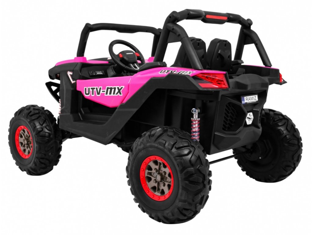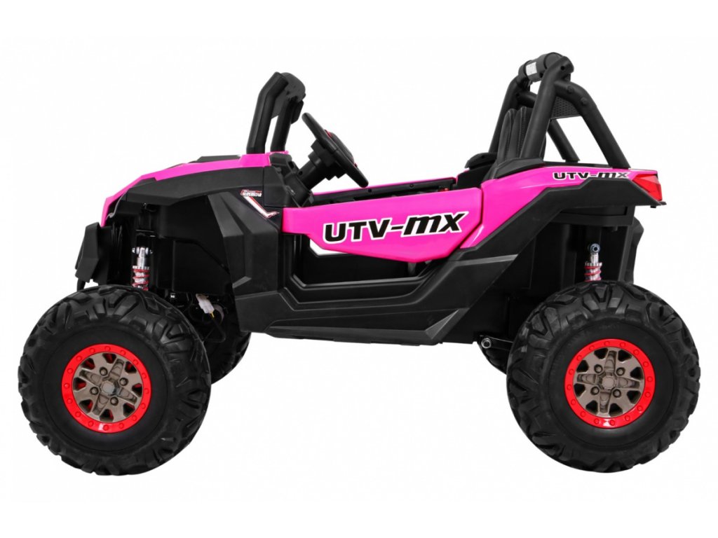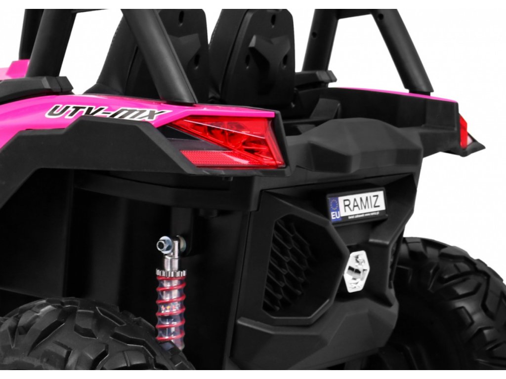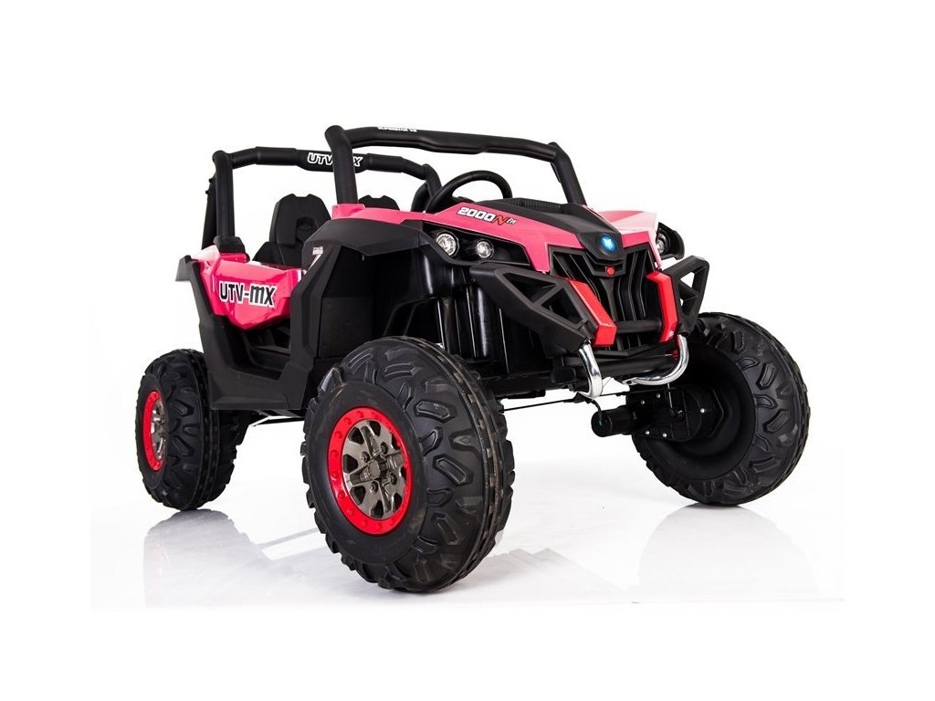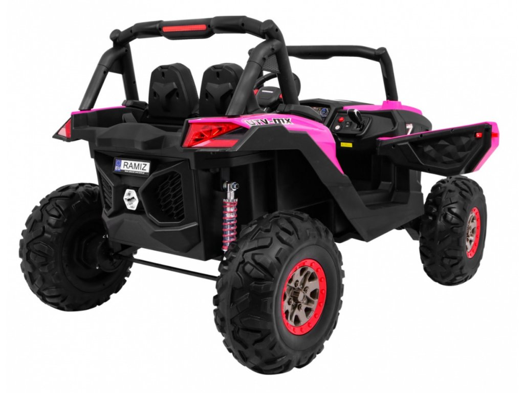 Tato velká dvoumístná bugina 4x4 má nádherný vzhled terénního vozidla, kvalitní materiály a zpracování. Má otvírací dveře, jezdí vpřed/vzad na nožní pedál, velký LCD displej pro přehrávání videa, nebo se ovládá dálkovým ovladačem se 3 rychlostmi vpřed, 3 vzad, pravá/levá, s přednostní jízdou nad pedálem tzn. dítě můžete ovladačem zastavit. Jízda vpřed/vzad se ovládá řadící páčkou na přístrojové desce. Bugína má přední a zadní světla LED. Start motoru, zvukové efekty, klakson, písničky jsou ovládané na volantu, přehrávačem FM, Mp3, MP4, TF s krásným zvukem volíte vlastní hudbu a hlasitost. Zadní náprava je odpružená. Veliká EVA kola (jako gumová) zajišťují tichou a příjemnou jízdu. Při nesešlápnutém pedálu tah motoru nahrazuje brzdu nebo brzdíte ovladačem. Auto má náhon na všechny 4 kola, tím je vhodné i pro jízdu v terénu. Pro větší bezpečnost dětí jsou na luxusní čalouněné sedačce 2 nastavitelné bezpečnostní pásy a 2 ochranné rámy. Navíc tato verze obsahuje LCD panel, kde lze přehrávat oblíbené pohádky Vašeho dítěte a má odpruženy obě nápravy. Oproti konkurenci má navíc naše bugina páčku změny rychlostí ,,1-2-3 / zpátečka" na palubní desce, startování klíčem, přední a zadní odpružení. Naši kluci také testovali tuto bugínu.