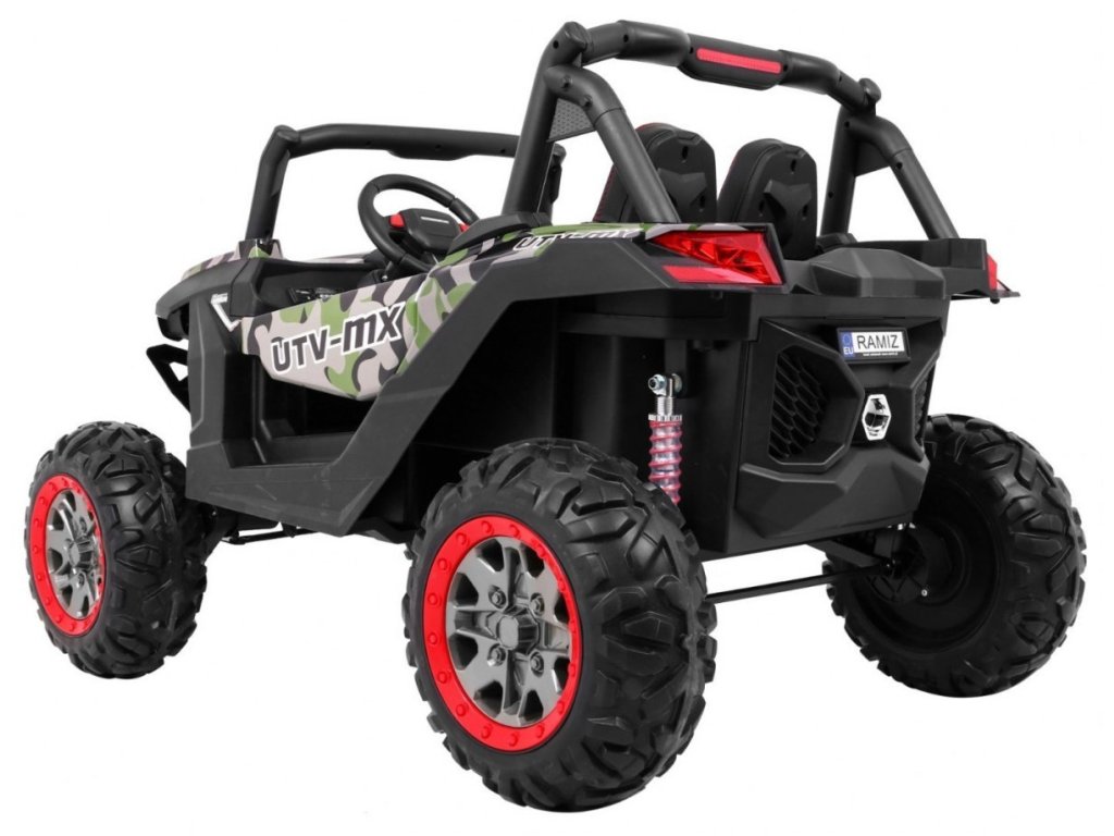 Tato velká dvoumístná bugina 4x4 má nádherný vzhled terénního vozidla, kvalitní materiály a zpracování. Má otvírací dveře, jezdí vpřed/vzad na nožní pedál, velký LCD displej pro přehrávání videa, nebo se ovládá dálkovým ovladačem se 3 rychlostmi vpřed, 3 vzad, pravá/levá, s přednostní jízdou nad pedálem tzn. dítě můžete ovladačem zastavit. Jízda vpřed/vzad se ovládá řadící páčkou na přístrojové desce. Bugína má přední a zadní světla LED. Start motoru, zvukové efekty, klakson, písničky jsou ovládané na volantu, přehrávačem FM, Mp3, MP4, TF s krásným zvukem volíte vlastní hudbu a hlasitost. Zadní náprava je odpružená. Veliká EVA kola (jako gumová) zajišťují tichou a příjemnou jízdu. Při nesešlápnutém pedálu tah motoru nahrazuje brzdu nebo brzdíte ovladačem. Auto má náhon na všechny 4 kola, tím je vhodné i pro jízdu v terénu. Pro větší bezpečnost dětí jsou na luxusní čalouněné sedačce 2 nastavitelné bezpečnostní pásy a 2 ochranné rámy. Navíc tato verze obsahuje LCD panel, kde lze přehrávat oblíbené pohádky Vašeho dítěte a má odpruženy obě nápravy. Oproti konkurenci má navíc naše bugina páčku změny rychlostí ,,1-2-3 / zpátečka" na palubní desce, startování klíčem, přední a zadní odpružení. Naši kluci také testovali tuto bugínu.