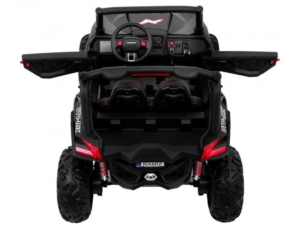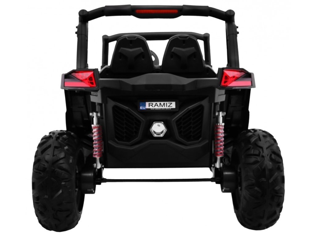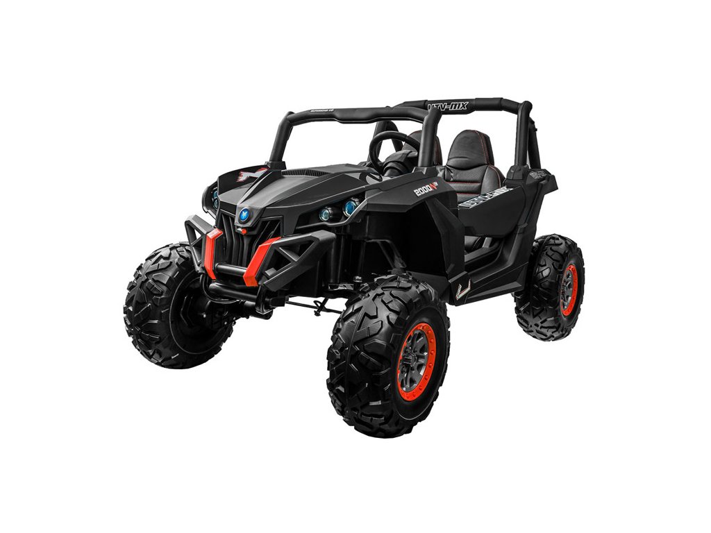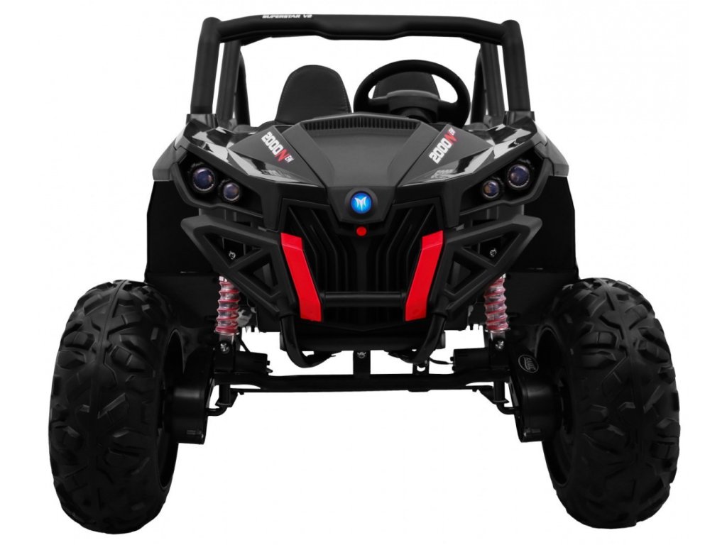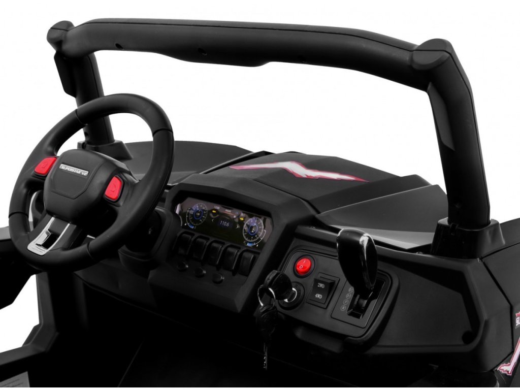 Tato velká dvoumístná bugina 4x4 má nádherný vzhled terénního vozidla, kvalitní materiály a zpracování. Má otvírací dveře, jezdí vpřed/vzad na nožní pedál, velký LCD displej pro přehrávání videa, nebo se ovládá dálkovým ovladačem se 3 rychlostmi vpřed, 3 vzad, pravá/levá, s přednostní jízdou nad pedálem tzn. dítě můžete ovladačem zastavit. Jízda vpřed/vzad se ovládá řadící páčkou na přístrojové desce. Bugína má přední a zadní světla LED. Start motoru, zvukové efekty, klakson, písničky jsou ovládané na volantu, přehrávačem FM, Mp3, MP4, TF s krásným zvukem volíte vlastní hudbu a hlasitost. Zadní náprava je odpružená. Veliká EVA kola (jako gumová) zajišťují tichou a příjemnou jízdu. Při nesešlápnutém pedálu tah motoru nahrazuje brzdu nebo brzdíte ovladačem. Auto má náhon na všechny 4 kola, tím je vhodné i pro jízdu v terénu. Pro větší bezpečnost dětí jsou na luxusní čalouněné sedačce 2 nastavitelné bezpečnostní pásy a 2 ochranné rámy. Navíc tato verze obsahuje LCD panel, kde lze přehrávat oblíbené pohádky Vašeho dítěte a má odpruženy obě nápravy. Oproti konkurenci má navíc naše bugina páčku změny rychlostí ,,1-2-3 / zpátečka" na palubní desce, startování klíčem, přední a zadní odpružení. Naši kluci také testovali tuto bugínu.