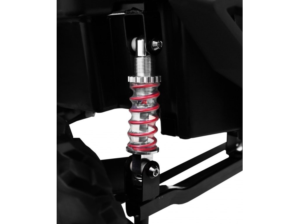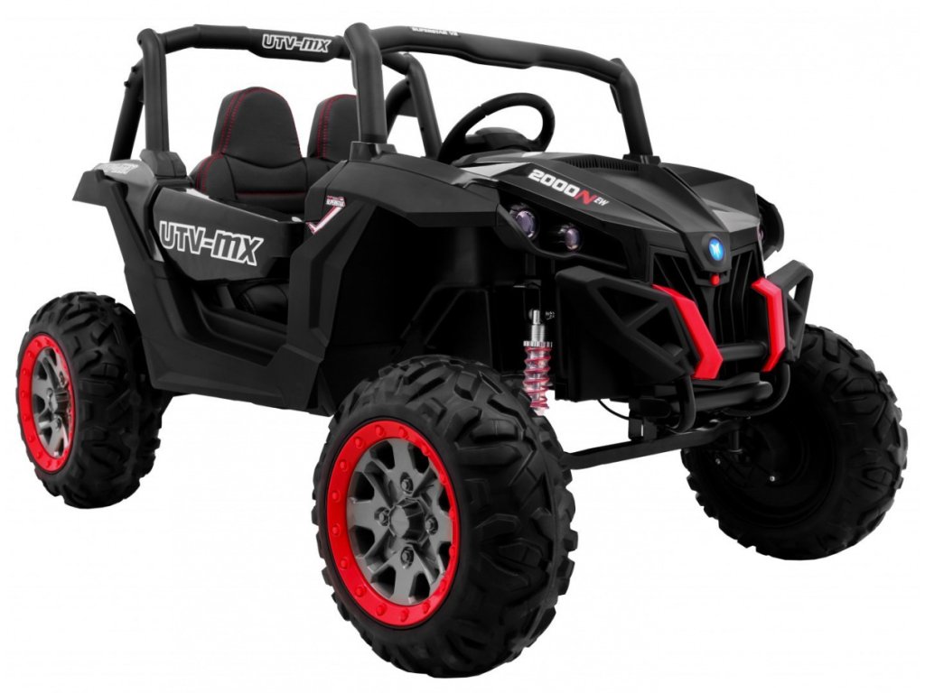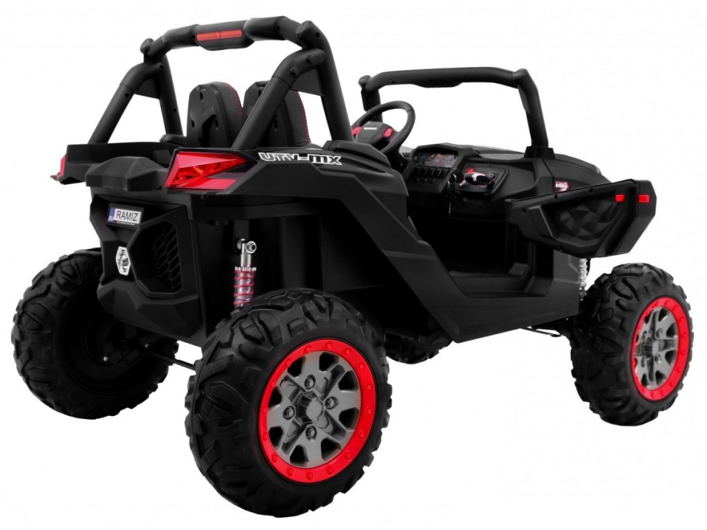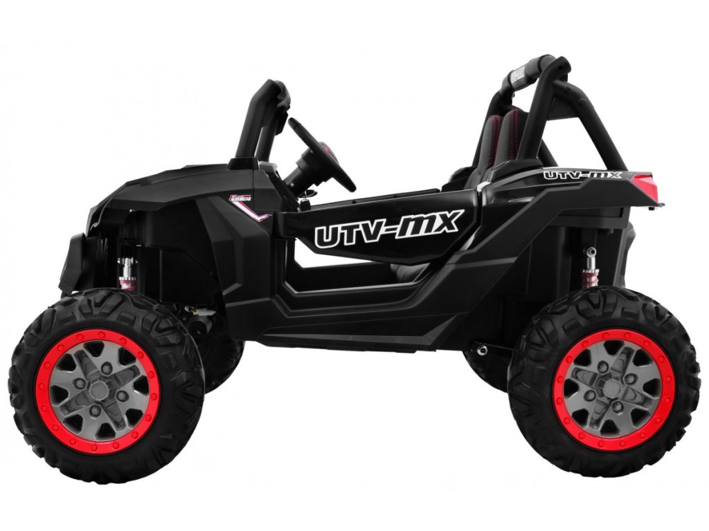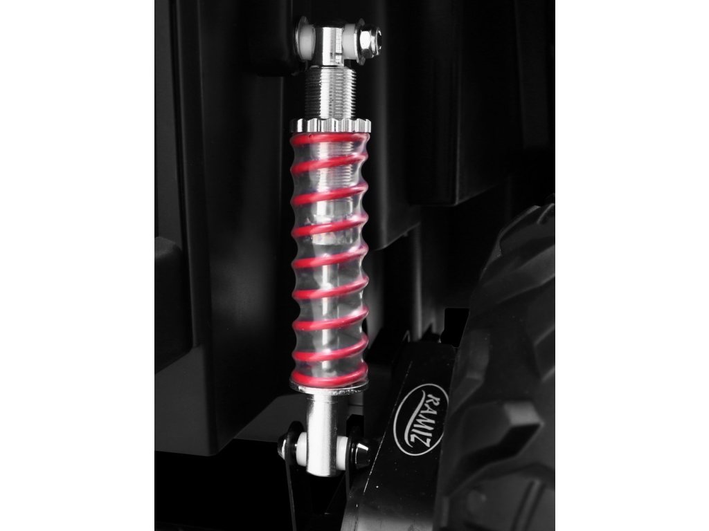 Tato velká dvoumístná bugina 4x4 má nádherný vzhled terénního vozidla, kvalitní materiály a zpracování. Má otvírací dveře, jezdí vpřed/vzad na nožní pedál, velký LCD displej pro přehrávání videa, nebo se ovládá dálkovým ovladačem se 3 rychlostmi vpřed, 3 vzad, pravá/levá, s přednostní jízdou nad pedálem tzn. dítě můžete ovladačem zastavit. Jízda vpřed/vzad se ovládá řadící páčkou na přístrojové desce. Bugína má přední a zadní světla LED. Start motoru, zvukové efekty, klakson, písničky jsou ovládané na volantu, přehrávačem FM, Mp3, MP4, TF s krásným zvukem volíte vlastní hudbu a hlasitost. Zadní náprava je odpružená. Veliká EVA kola (jako gumová) zajišťují tichou a příjemnou jízdu. Při nesešlápnutém pedálu tah motoru nahrazuje brzdu nebo brzdíte ovladačem. Auto má náhon na všechny 4 kola, tím je vhodné i pro jízdu v terénu. Pro větší bezpečnost dětí jsou na luxusní čalouněné sedačce 2 nastavitelné bezpečnostní pásy a 2 ochranné rámy. Navíc tato verze obsahuje LCD panel, kde lze přehrávat oblíbené pohádky Vašeho dítěte a má odpruženy obě nápravy. Oproti konkurenci má navíc naše bugina páčku změny rychlostí ,,1-2-3 / zpátečka" na palubní desce, startování klíčem, přední a zadní odpružení. Naši kluci také testovali tuto bugínu.