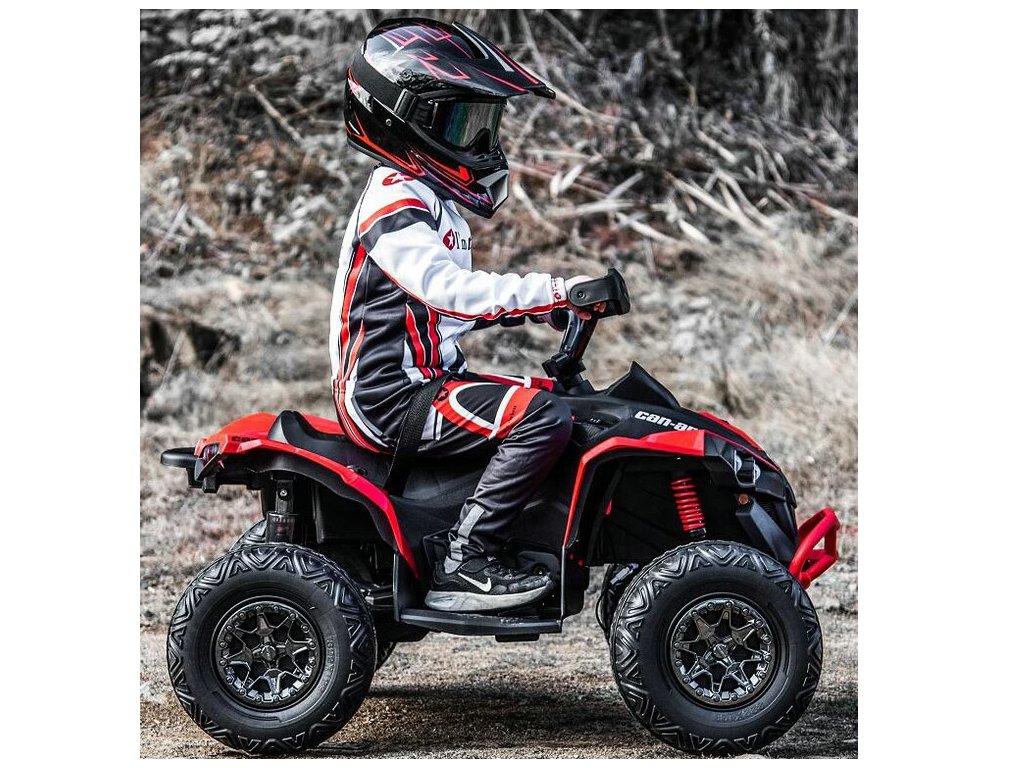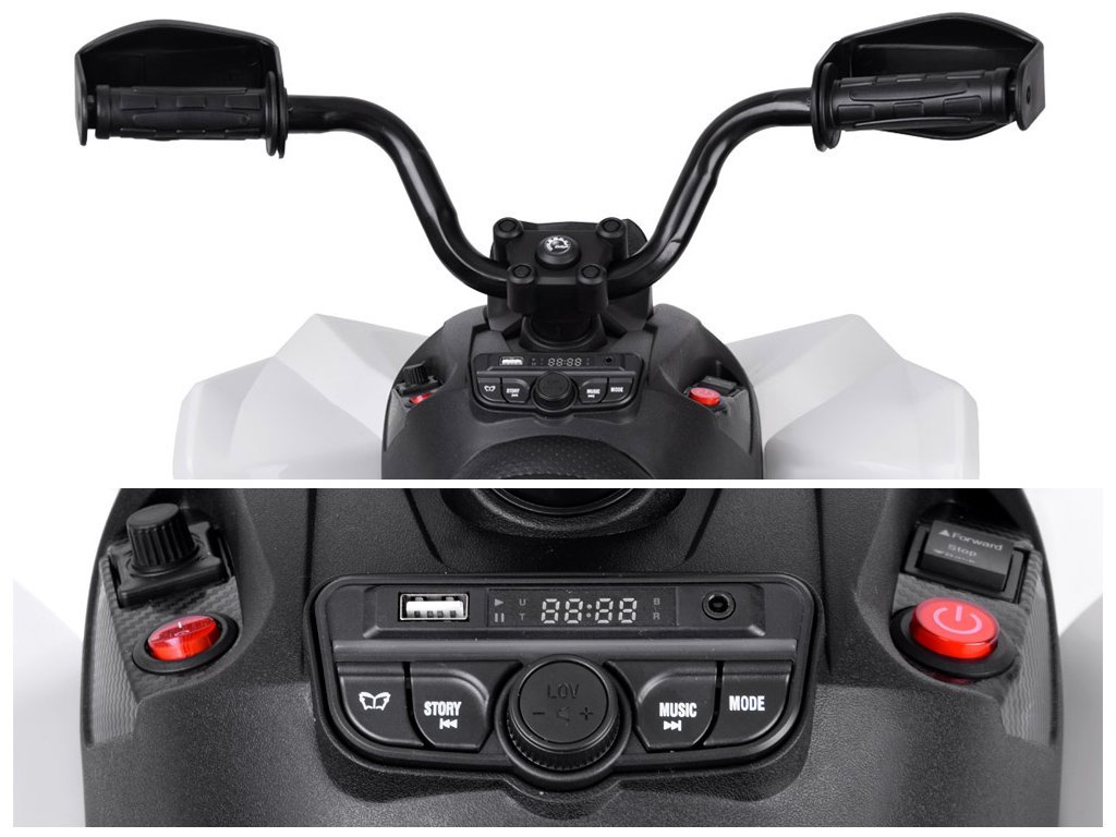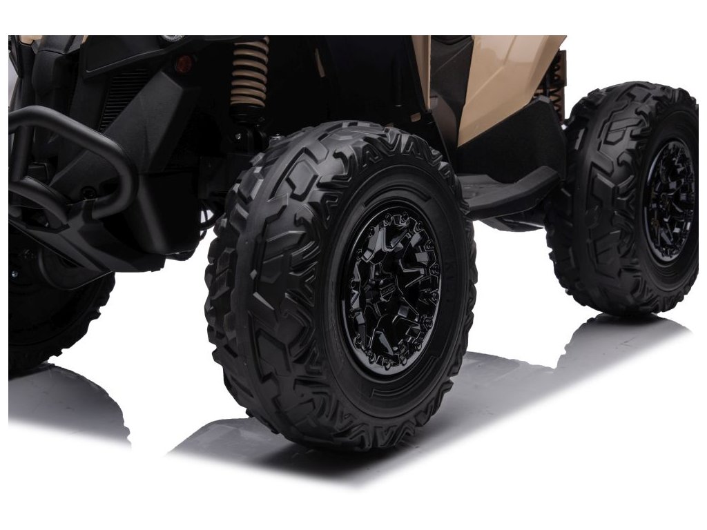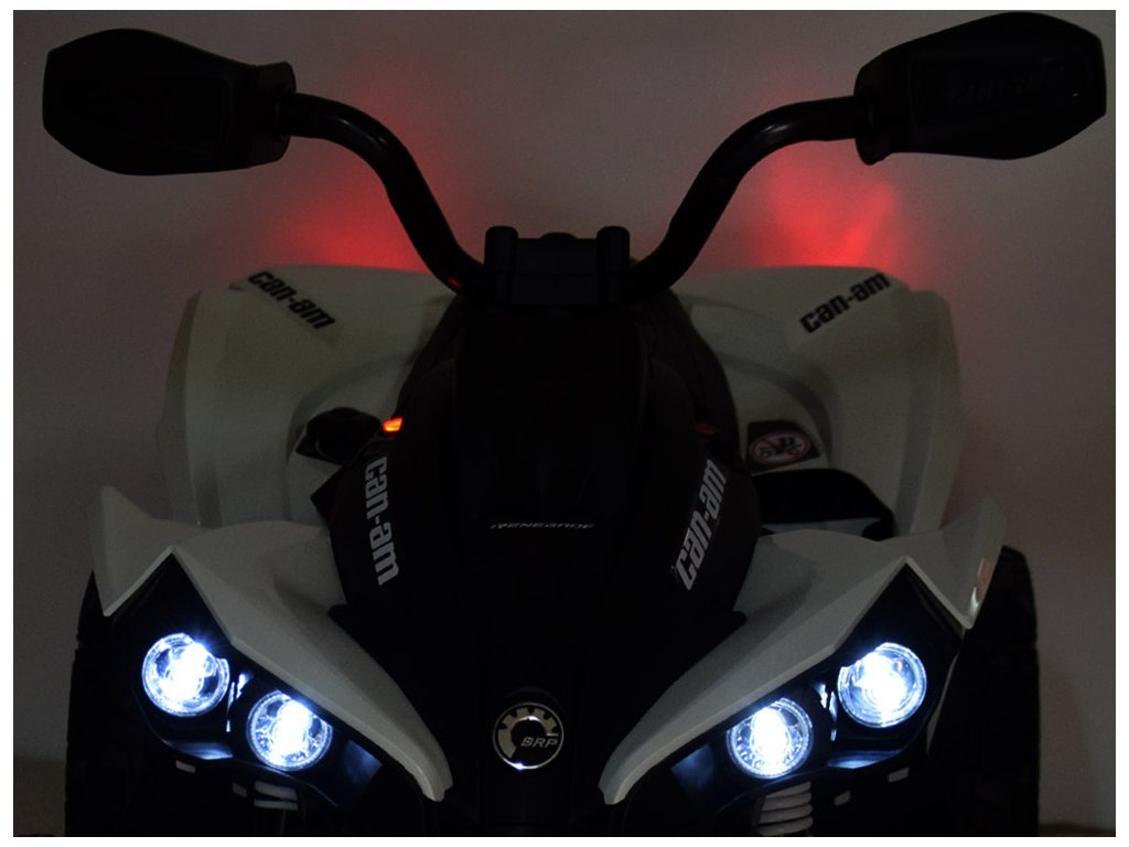 Nejnovější čtyřkolka off-road Can-am s EVA koly a zadními tlumiči poskytne každému malému řidiči spoustu zábavy při jízdě. Velká pohodlná čtyřkolka splní požadavky každého řidiče. Díky výkonným motorům (dohromady 400W) si vozidlo snadno poradí s kopci, nerovnostmi nebo trávou. Čtyřkolka se spouští tlačítkem, díky kterému dítě slyší zvuk spouštění motoru.