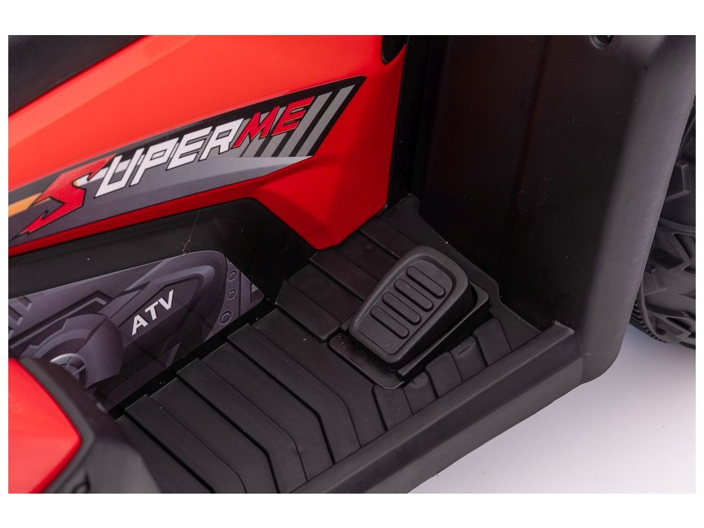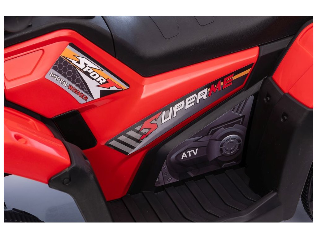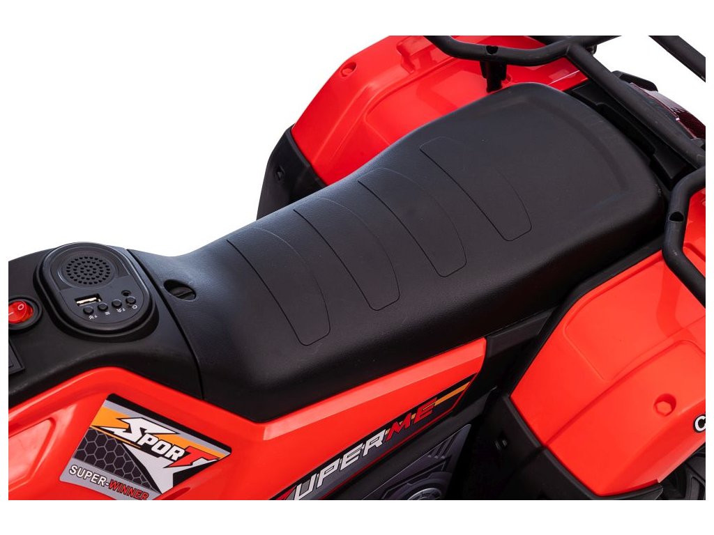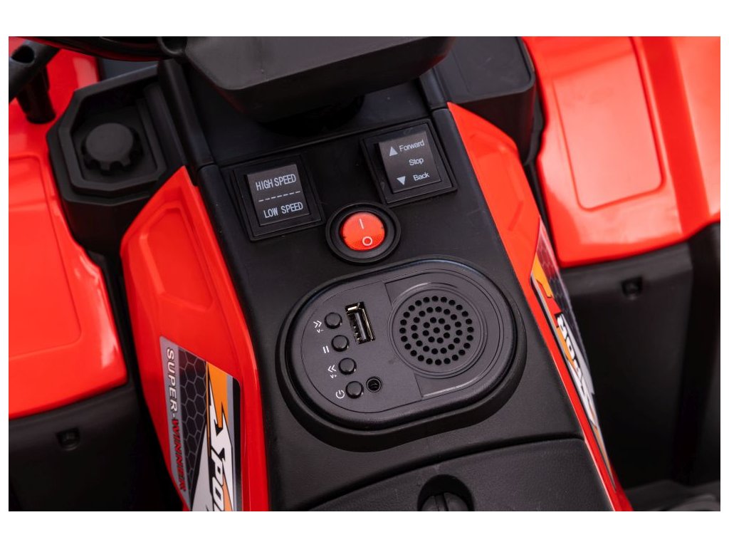 Dětská elektrická čtyřkolka je vybavena motorem 2x45W a baterií o výkonu 12V 4,5Ah. Čtyřkolka má zabudovaný hudební panel s MP3 a USB, přední LED světla. Čtyřkolka je vybavena plastovým sedadlem a plastovými koly.