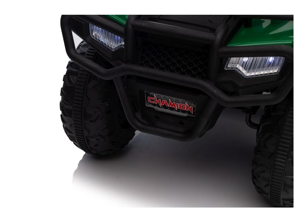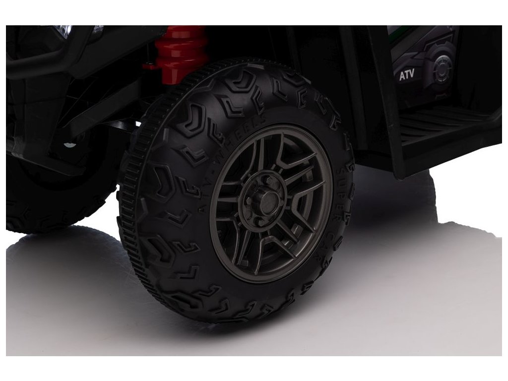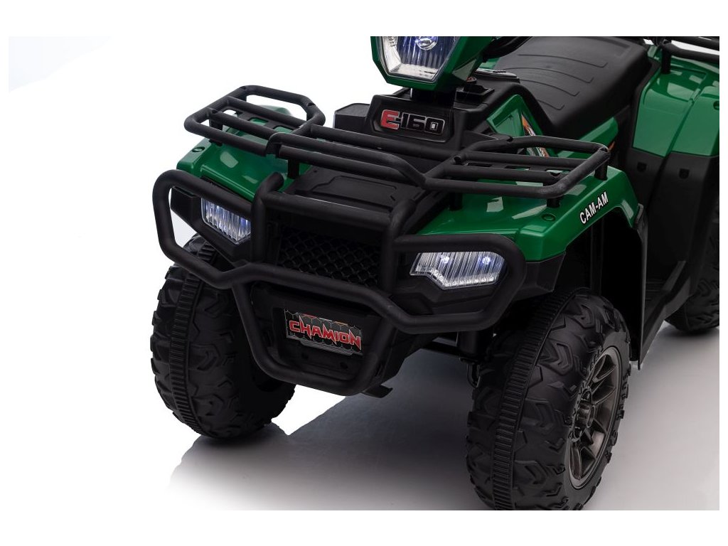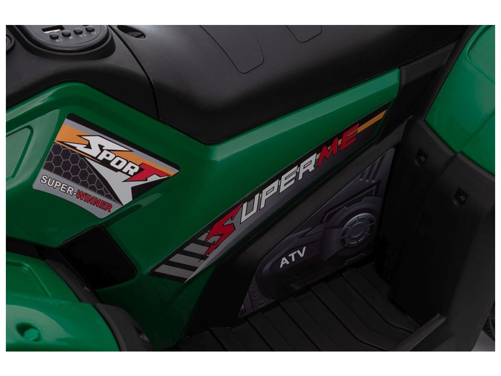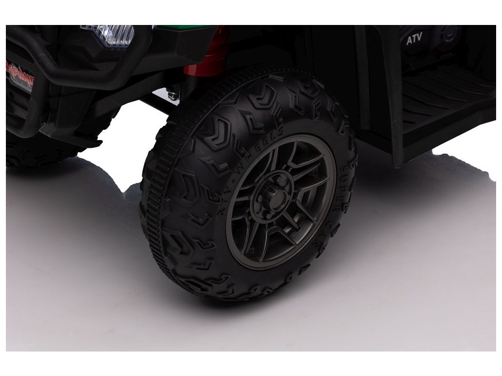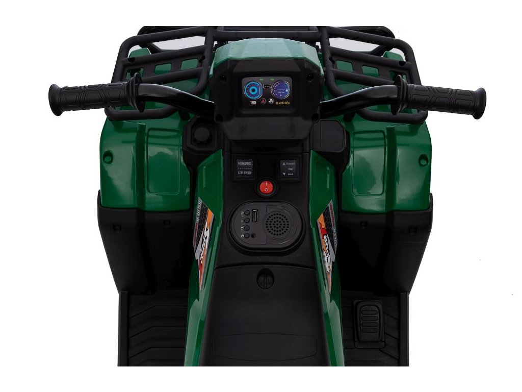 Dětská elektrická čtyřkolka je vybavena motorem 2x45W a baterií o výkonu 12V 4,5Ah. Čtyřkolka má zabudovaný hudební panel s MP3 a USB, přední LED světla. Čtyřkolka je vybavena plastovým sedadlem a plastovými koly.