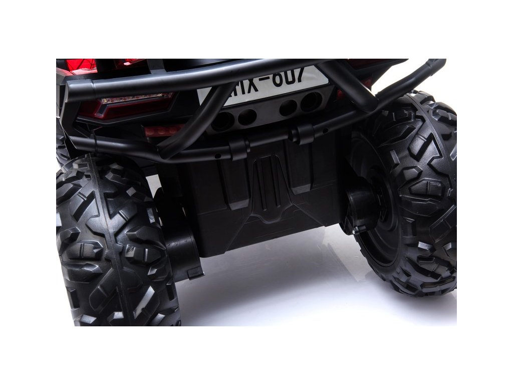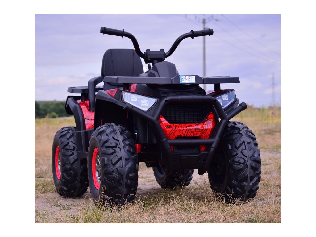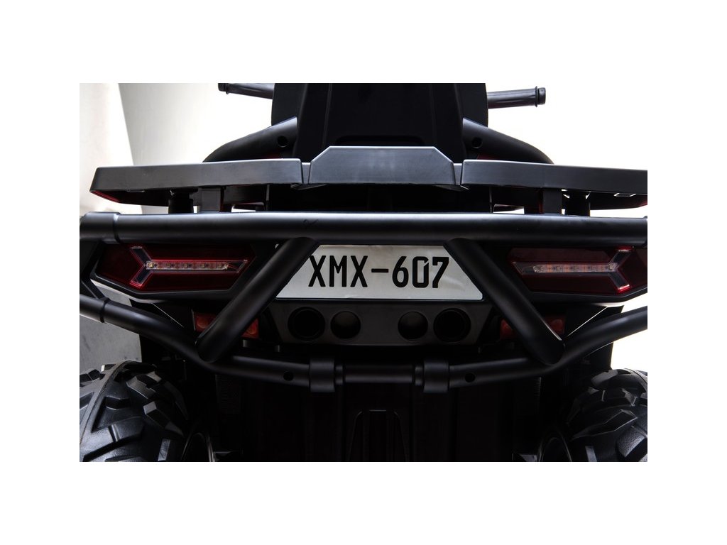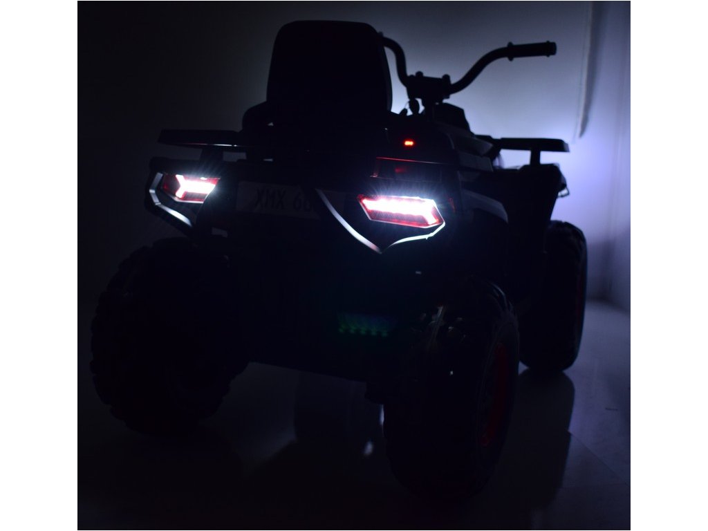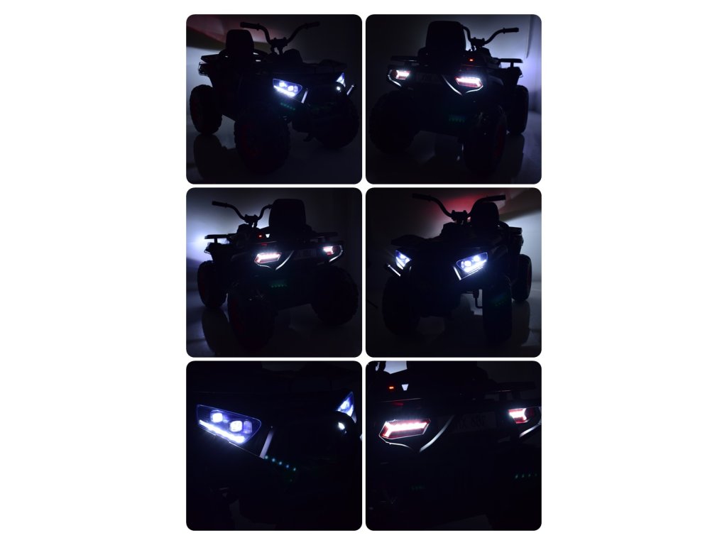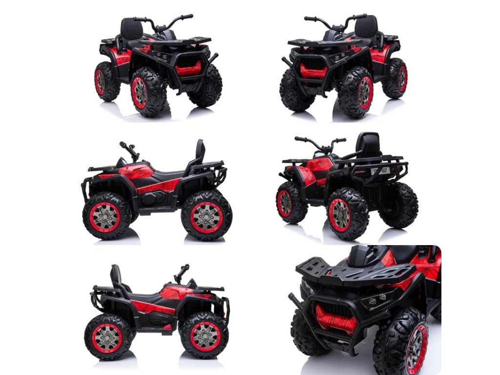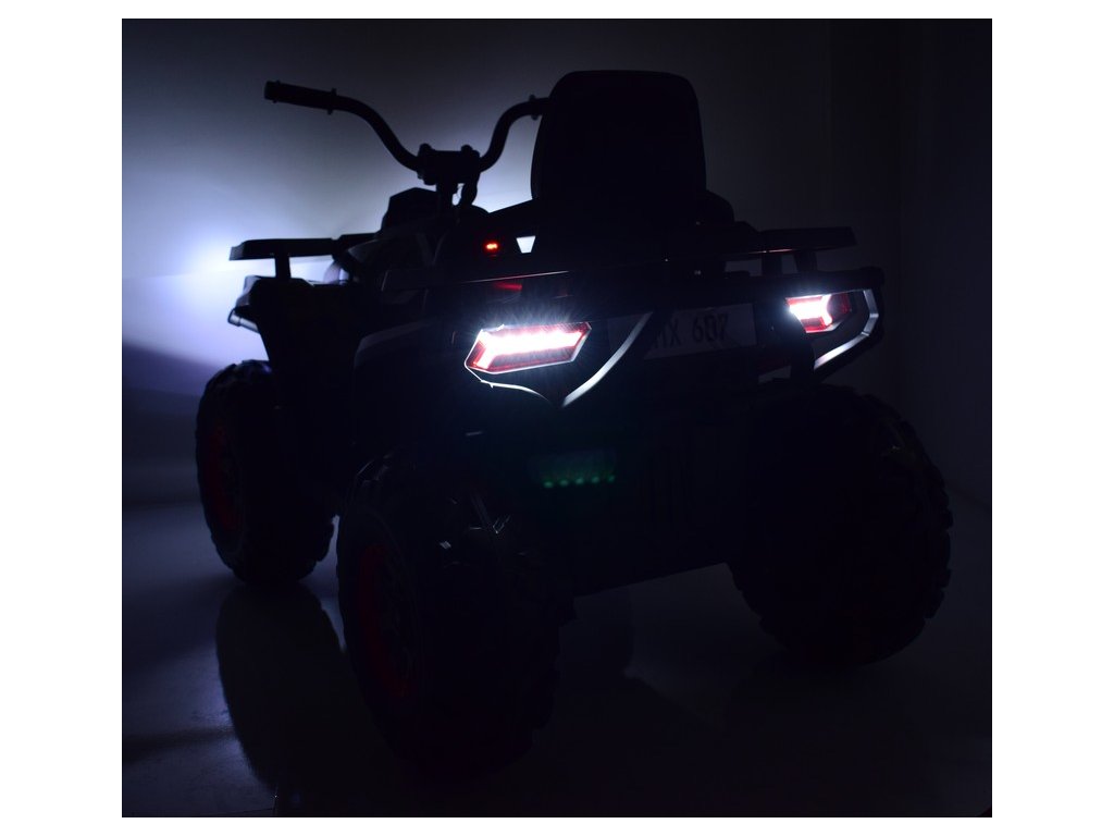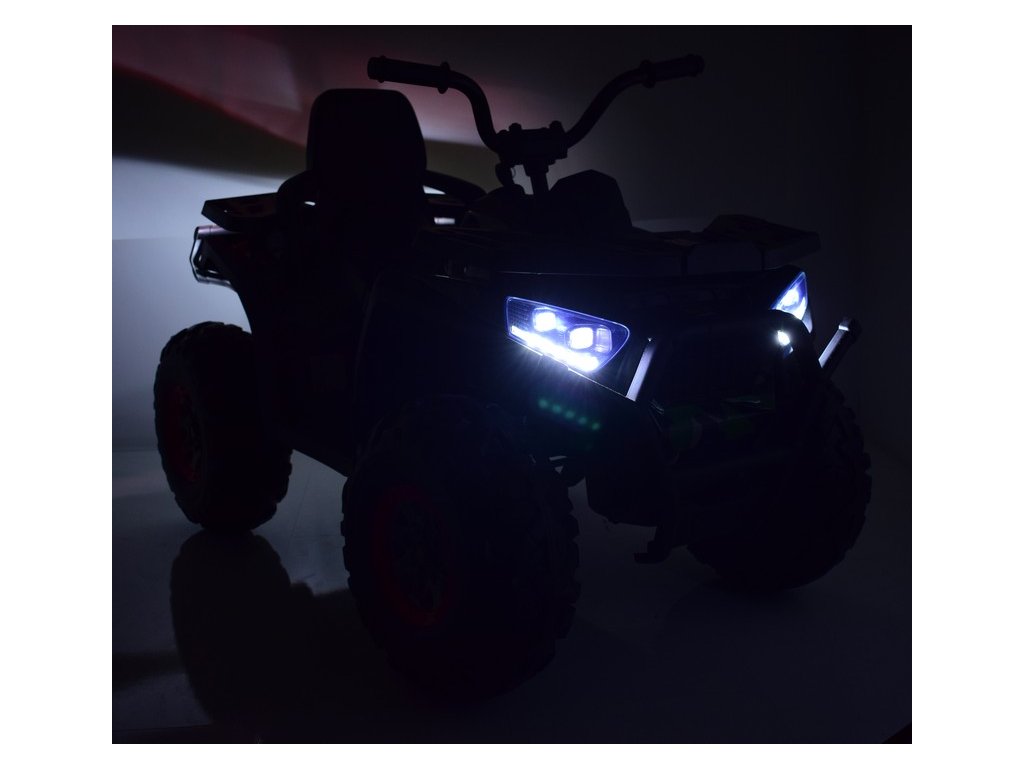 Čtyřkolka má 4 výkonné motory 12V 35W a 1 x 12V 10Ah gelovou baterii. Velká pohodlná čtyřkolka splní požadavky každého řidiče. Díky výkonným motorům a 2 rychlostem si vozidlo snadno poradí s kopci, nerovnostmi nebo trávou. Čtyřkolka se startuje pomocí klíčku, díky kterému dítě slyší zvuk startování motoru. Vozidlo má spínač, díky kterému bude dítě moci v případě potřeby přepínat motory z 2. na 4. rychlostní stupeň. Na palubní desce je také tlačítko zodpovědné za rychlou a pomalou jízdu a také spínač vpřed, zastavení a vzad. Osvětlení ve čtyřkolce má také svůj vypínač. Čtyřkolka má hudební modul se vstupem pro USB, MP3 a mini SD kartu. Osvětlené hodiny a LED osvětlení činí vozidlo atraktivnějším. Čtyřkolka má tlumiče a široký pohodlný sedák s opěradlem. Řízení této čtyřkolky je čiré potěšení. Plast použitý na tuto čtyřkolku je velmi kvalitní, takže mladému uživateli bude sloužit dlouhou dobu.