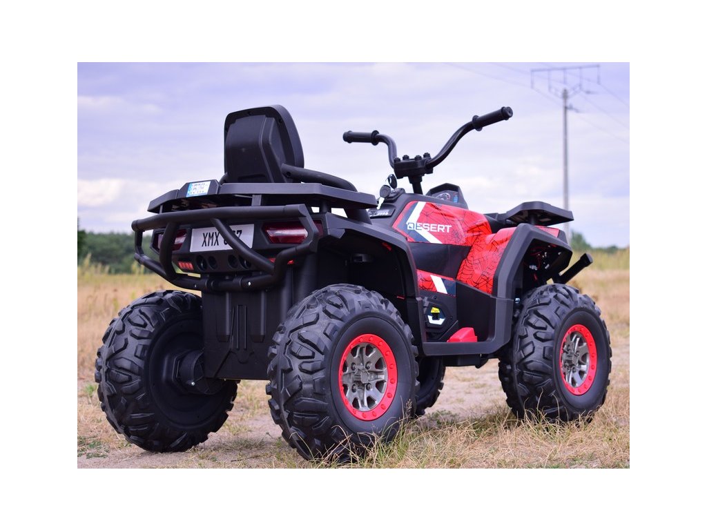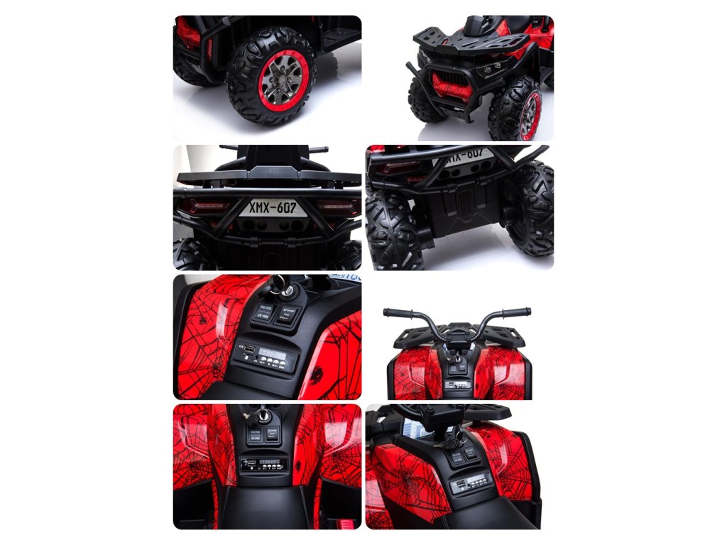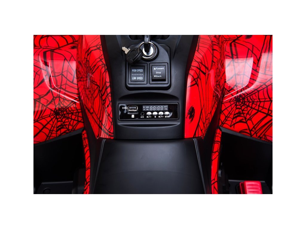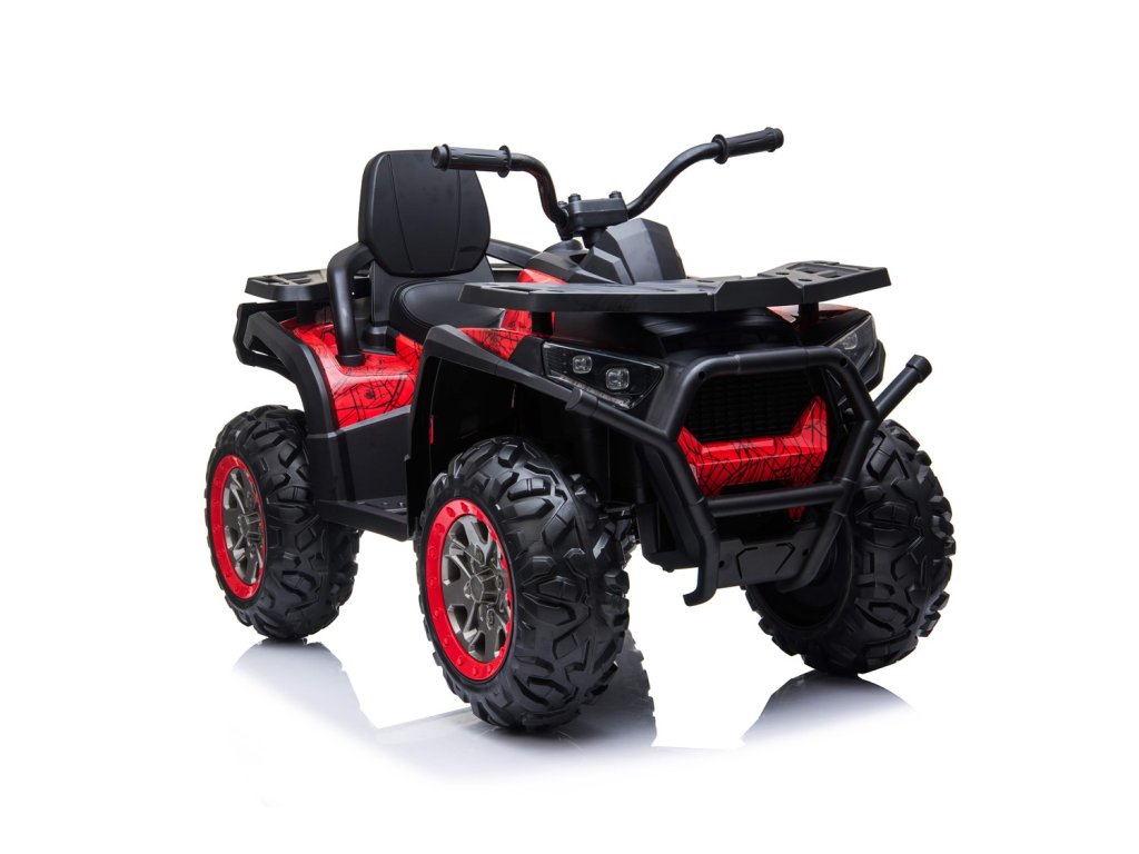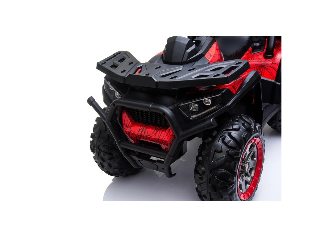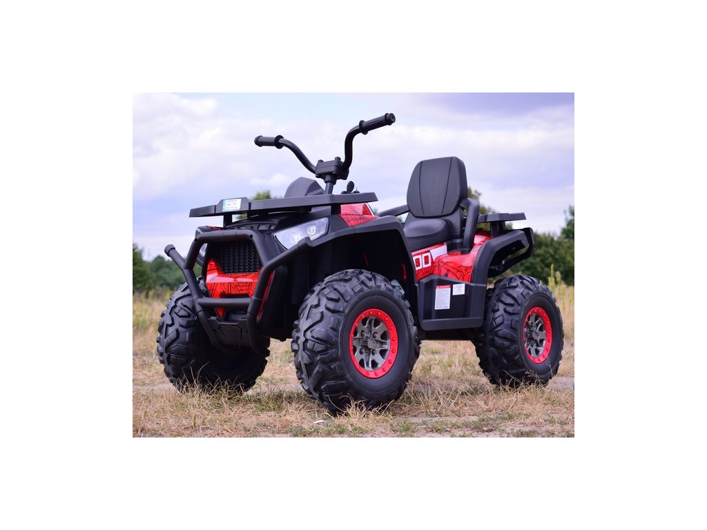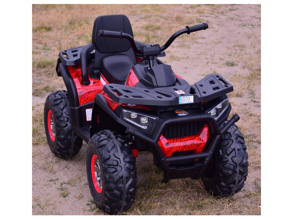 Čtyřkolka má 4 výkonné motory 12V 35W a 1 x 12V 10Ah gelovou baterii. Velká pohodlná čtyřkolka splní požadavky každého řidiče. Díky výkonným motorům a 2 rychlostem si vozidlo snadno poradí s kopci, nerovnostmi nebo trávou. Čtyřkolka se startuje pomocí klíčku, díky kterému dítě slyší zvuk startování motoru. Vozidlo má spínač, díky kterému bude dítě moci v případě potřeby přepínat motory z 2. na 4. rychlostní stupeň. Na palubní desce je také tlačítko zodpovědné za rychlou a pomalou jízdu a také spínač vpřed, zastavení a vzad. Osvětlení ve čtyřkolce má také svůj vypínač. Čtyřkolka má hudební modul se vstupem pro USB, MP3 a mini SD kartu. Osvětlené hodiny a LED osvětlení činí vozidlo atraktivnějším. Čtyřkolka má tlumiče a široký pohodlný sedák s opěradlem. Řízení této čtyřkolky je čiré potěšení. Plast použitý na tuto čtyřkolku je velmi kvalitní, takže mladému uživateli bude sloužit dlouhou dobu.