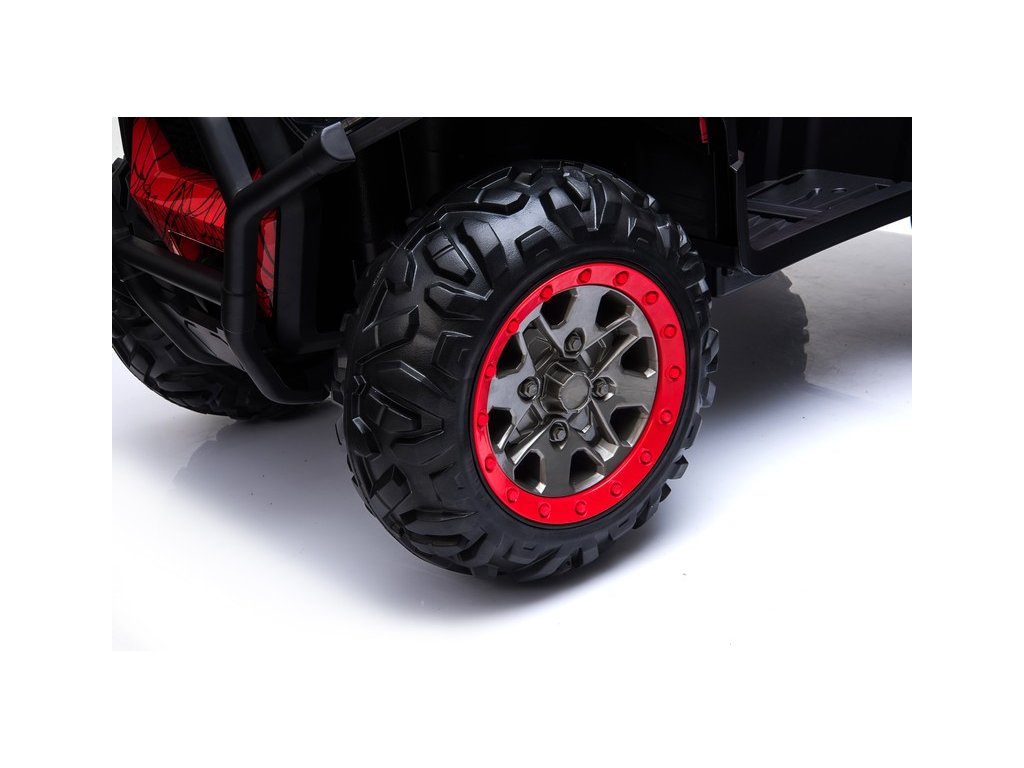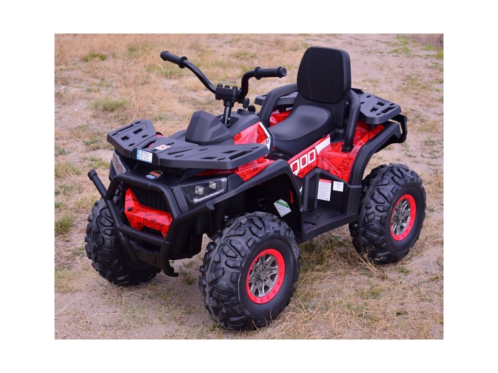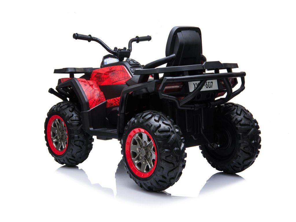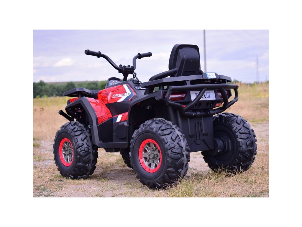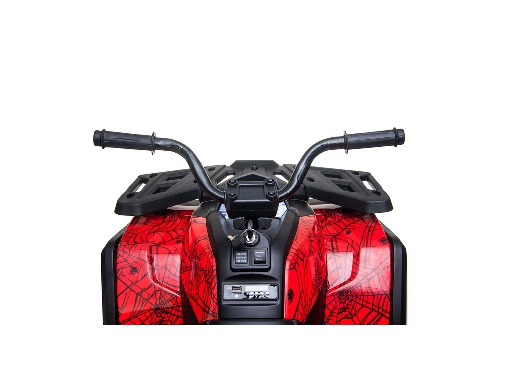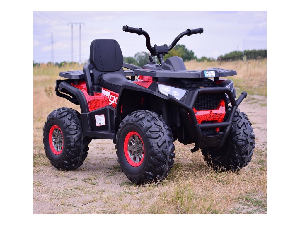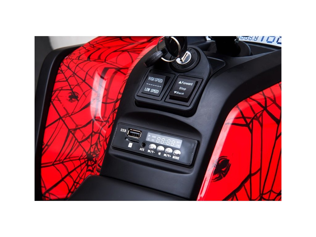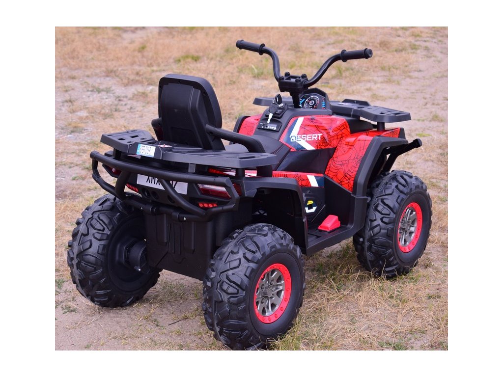 Čtyřkolka má 4 výkonné motory 12V 35W a 1 x 12V 10Ah gelovou baterii. Velká pohodlná čtyřkolka splní požadavky každého řidiče. Díky výkonným motorům a 2 rychlostem si vozidlo snadno poradí s kopci, nerovnostmi nebo trávou. Čtyřkolka se startuje pomocí klíčku, díky kterému dítě slyší zvuk startování motoru. Vozidlo má spínač, díky kterému bude dítě moci v případě potřeby přepínat motory z 2. na 4. rychlostní stupeň. Na palubní desce je také tlačítko zodpovědné za rychlou a pomalou jízdu a také spínač vpřed, zastavení a vzad. Osvětlení ve čtyřkolce má také svůj vypínač. Čtyřkolka má hudební modul se vstupem pro USB, MP3 a mini SD kartu. Osvětlené hodiny a LED osvětlení činí vozidlo atraktivnějším. Čtyřkolka má tlumiče a široký pohodlný sedák s opěradlem. Řízení této čtyřkolky je čiré potěšení. Plast použitý na tuto čtyřkolku je velmi kvalitní, takže mladému uživateli bude sloužit dlouhou dobu.