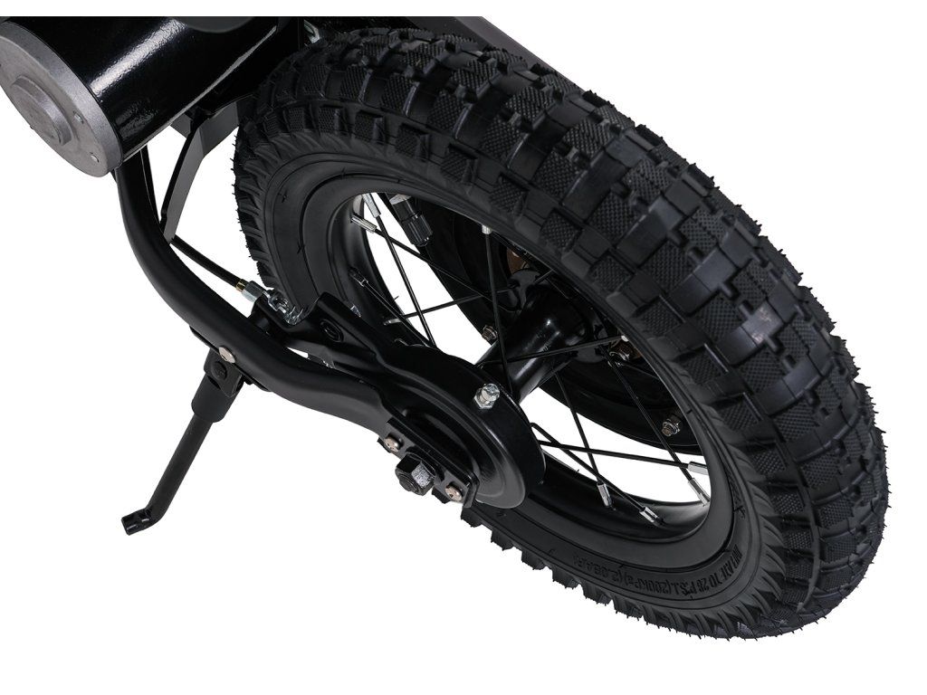 Bezpečnost a komfort jsou prioritou. Motorka disponuje pevným, odolným rámem s práškovým nástřikem a zesílenou zadní kyvnou vidlicí, což zaručuje vysokou stabilitu a životnost. Nafukovací pneumatiky s hrubým vzorkem se postarají o skvělou trakci na různých površích, zatímco spolehlivá zadní bubnová brzda zajistí bezpečné zastavení. Pohodlí při jízdě zajišťuje měkké, voděodolné sedadlo z odolného materiálu, které je navrženo pro dlouhé hodiny hraní. S nosností až 40 kg je tato motorka připravena na spoustu dobrodružství.