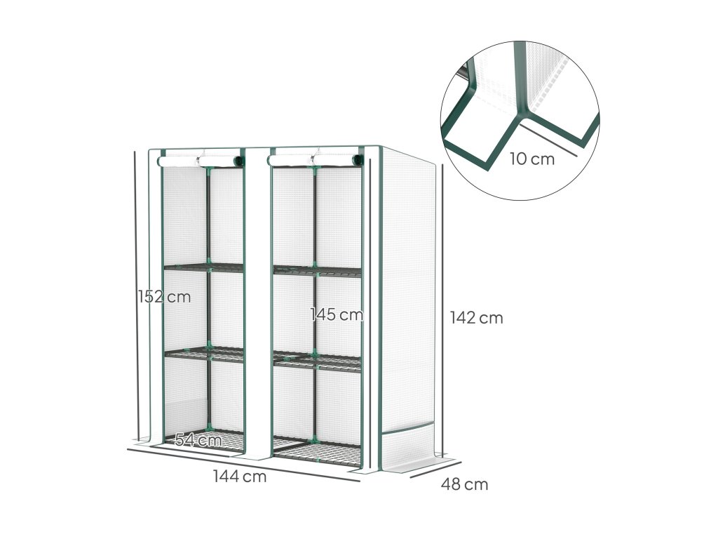 Konstrukce fóliovníku je vyrobená z pevných kovových trubek. Průhledný kryt s dvojitým zipem zajišťuje snadný přístup.