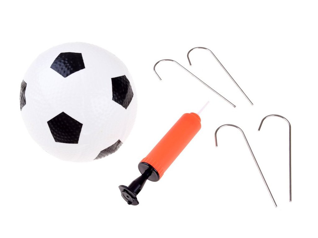 - Obsah sady: 2x skládací branka, nafukovací míč, pumpička, 4x kolík, obal-pouzdro na sadu