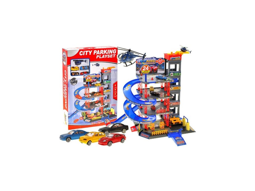 Třípatrová garáž s autíčky a vrtulníkem je skvělou naučnou hračkou, která rozvíjí fantazii dítěte. Součásti hračky je i výtah, díky kterému se auta mohou snadno pohybovat mezi patry. Chcete-li se dostat na parkoviště, musíte zvednout rampu. Garáž obsahuje mnoho dodatečných předmětů, jako jsou dopravní značky či kužely.