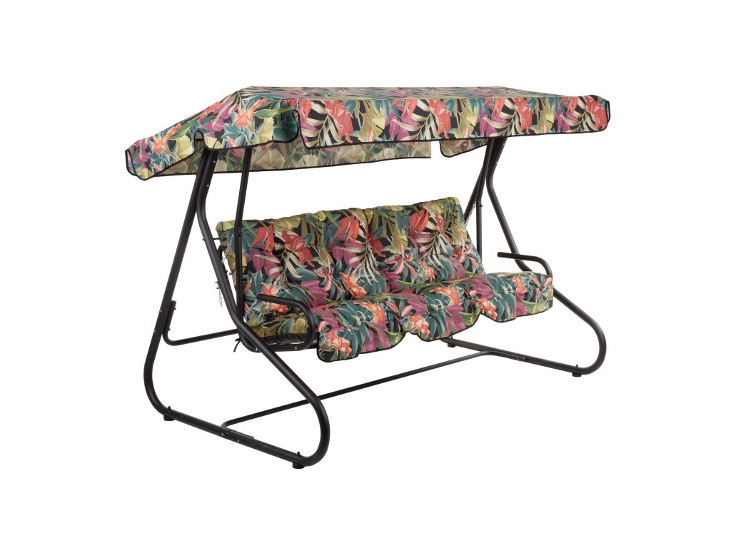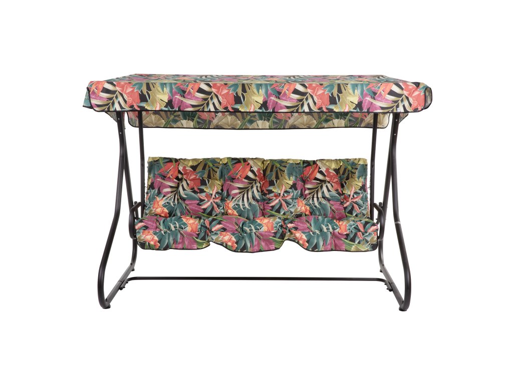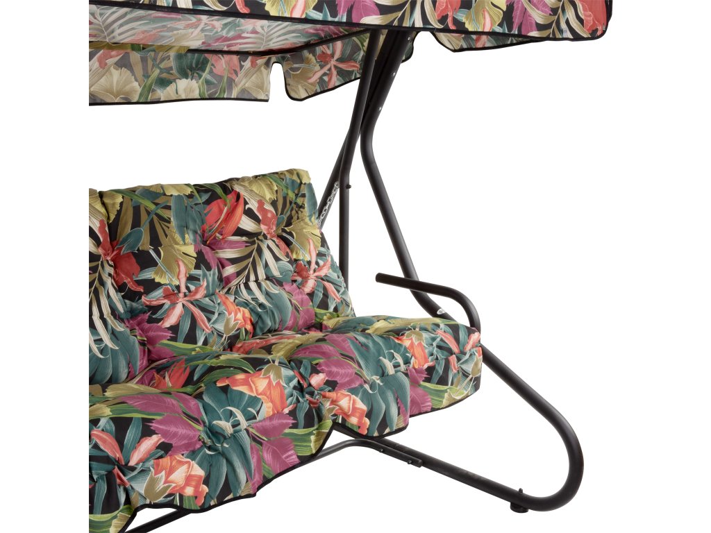 Zahradní houpačka s černým rámem. Objevte nový rozměr relaxace se zahradní houpačkou Milano Black Edition. Jde o unikátní spojení moderního designu a praktičnosti, které obohatí každý venkovní prostor. Rám je práškově lakovaný matnou černou barvou, odolnou vůči korozi a se zvýšenou odolností na poškrábání. Funkce regulace opěradla umožňuje upravit polohu sezení podle vašich individuálních preferencí a zajistit tak nejvyšší úroveň pohodlí. Měkké a pohodlné sedáky. Dva prošívané, silné sedáky se vzorem tropických květů poskytují optimální pohodlí při relaxaci. Rám se vyznačuje klasickým vzhledem, který umožňuje jeho přizpůsobení různým stylům zahrad. Má stabilní pružinové sedadlo, které zajišťuje pohodlí a bezpečnost při používání zahradní houpačky a lze ho rozložit do polohy vleže na zádech. Za zmínku stojí, že se snadno montuje a udržuje, což umožňuje snadné použití po celou zahradní sezónu. Kombinuje estetiku, funkčnost a odolnost.