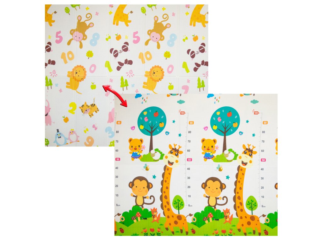 Protiskluzový povrch pomáhá udržet podložku stabilně na místě i při aktivnější hře, zatímco oboustranný potisk s dětskými motivy podporuje zrakové vnímání, orientaci a přirozenou zvídavost dítěte.