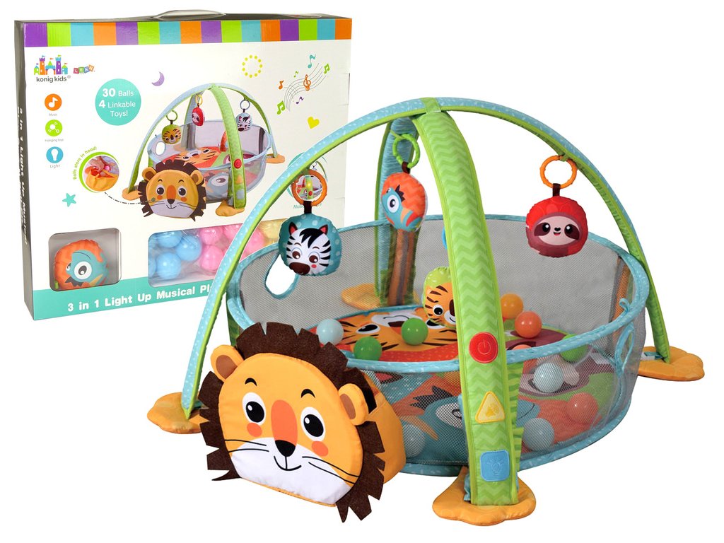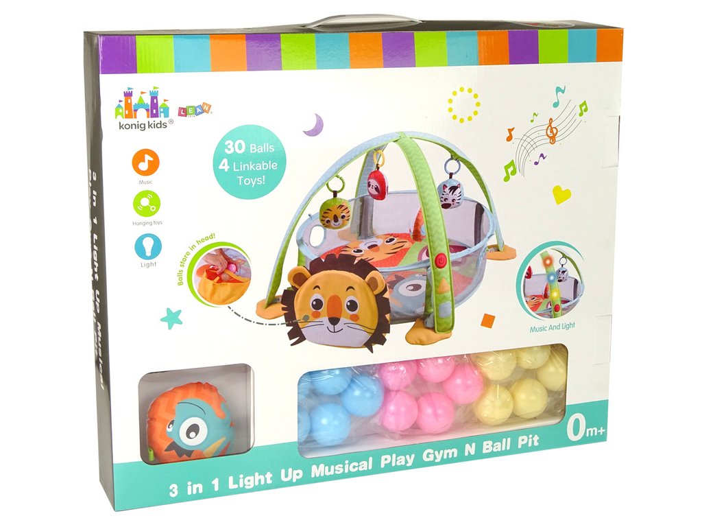 Podložka je vyrobena z materiálu, který je velmi příjemný na dotek a snadno se udržuje v čistotě. Vaše dítě v něm bude trávit čas a rozmanitost tvarů a barev umožní vašemu dítěti správný vývoj. Je navržena pro různé použití – vaše dítě si na ní může hrát, když leží na bříšku nebo na zádech, nebo sedí. Měkká podložka z příjemného materiálu na dotek má atraktivní, živé barvy, které upoutají pozornost i toho nejneklidnějšího miminka. Lev může být použit jako úložný prostor pro míčky. Vzdělávací podložka formuje dětskou fantazii, učí je rozlišovat tvary a barvy a rozvíjí hmat a zrak. Ležením na podložce si dítě rozvíjí motorické dovednosti a koordinaci rukou a očí tím, že se snaží uchopit přívěsky. Během prvních krůčků si vaše dítě může hrát v ohrádce s míčky, zatímco boční síťka vytvoří bezpečný prostor. Na obloucích jsou tlačítka, po jejich stisknutí batole bude při hře doprovázet hudba a svítící diody. Přinese to spoustu radosti a jistě to vykouzlí úsměv na tváři vašeho miminka.