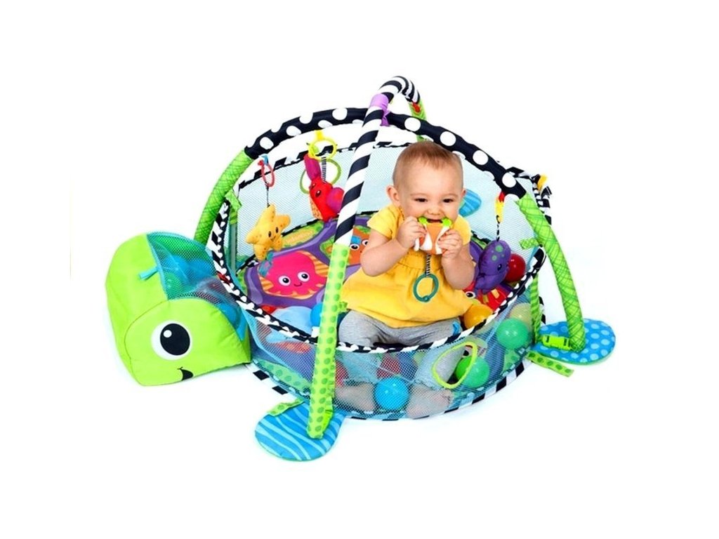 Měkká podložka z příjemného materiálu na dotek má atraktivní, zářivé barvy, které upoutají pozornost i toho nejneklidnějšího miminka. Formuje dětskou fantazii, učí je rozlišovat tvary a barvy a rozvíjí hmat a zrak. Pečuje o vývoj vašeho dítěte od prvního dne života. Je navržena pro různé použití – vaše dítě si na ní může hrát, když leží na bříšku nebo na zádech, nebo sedí. Produkt je dodáván s 30 míčky v různých barvách, které můžeme nalít do bazénu a zajistit si nezapomenutelnou zábavu. Pak se všechny míčky dají schovat do hlavy želvy a hra se změní z bazénu na hrací podložku. Sada obsahuje 4 různé mořské hračky, které lze zavěsit na oblouky. Přitáhnou jeho pozornost a bude chtít prozkoumat jejich strukturu a vzhled.